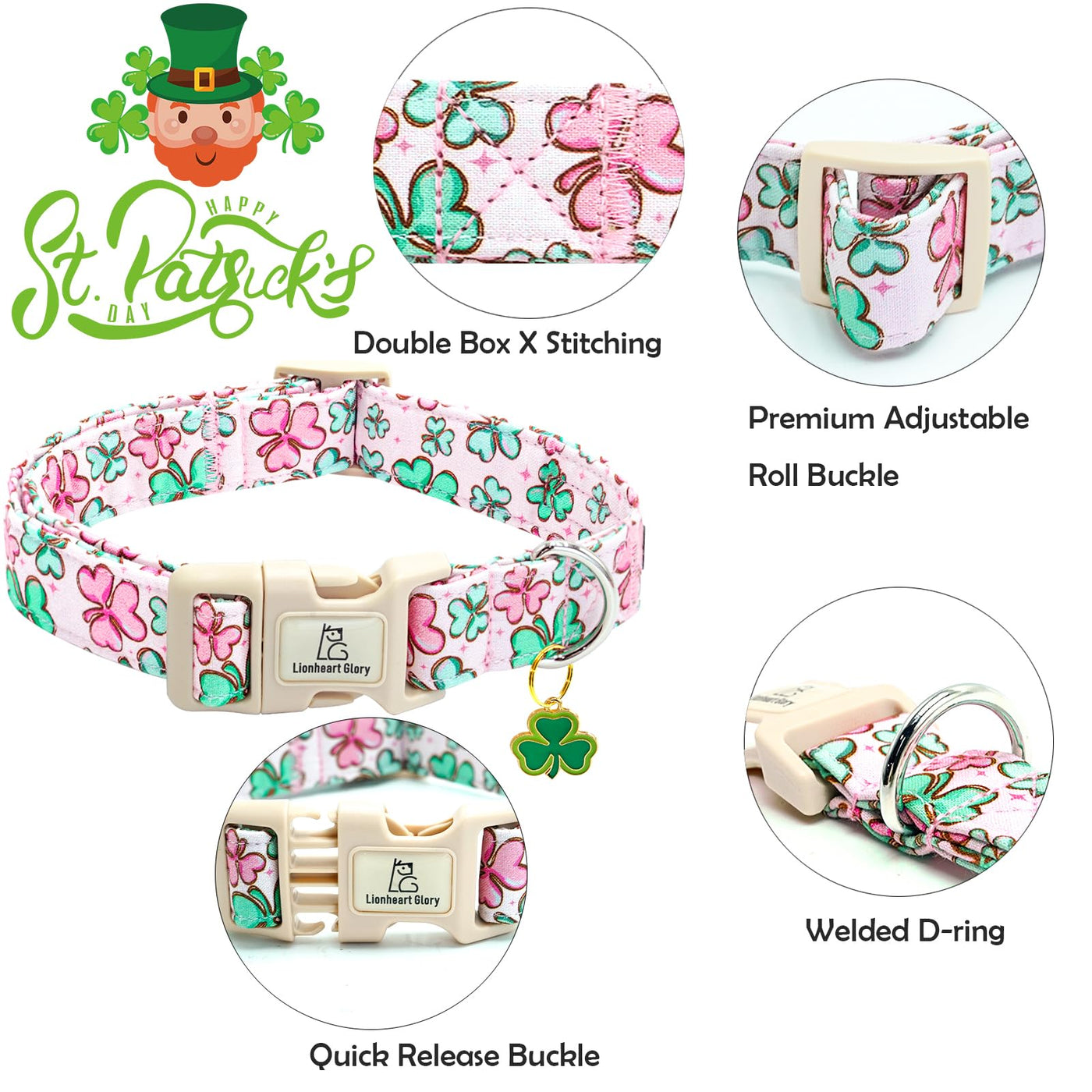Lionheart Glory St. Patrick Dog Collar, Clover Collars Pink Dog Collar For Medium Dogs Spring Female Dog Collar Adjustable Heavy