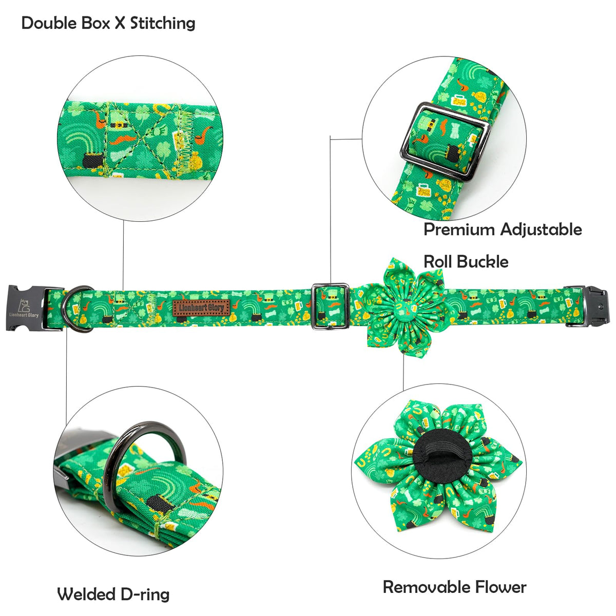 Lionheart Glory St. Patrick'S Day Collar With Flower Design For Small Dogs, Green Collar With Lucky Clover Shamrock Pattern, Hea