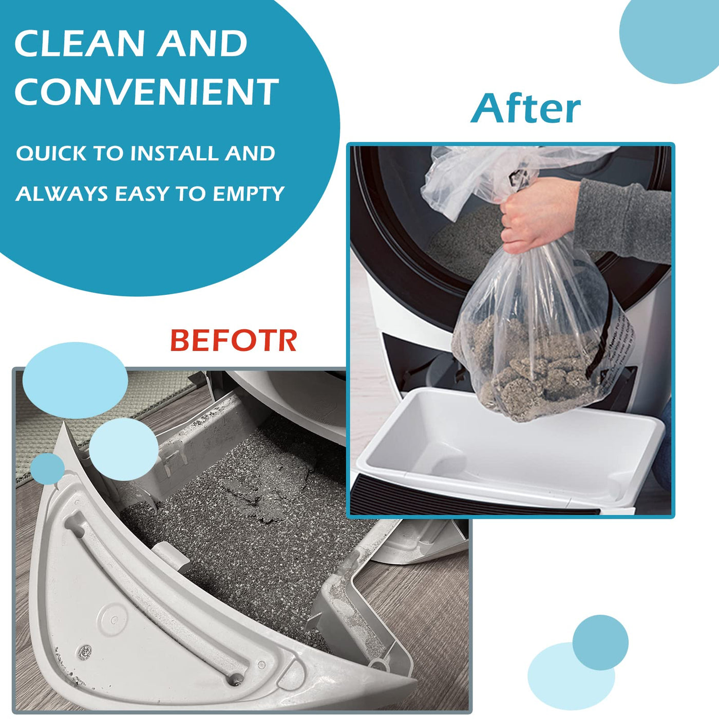 Capacity 9-11 Gallons | Easily Compatible With All Cat Litter Box Robot Models. Its Very Containable As These Plastic Bags Are Thick And Durable. Odor Control No Fret About Smelling Malodorous Air As These Bags Deodorize The Stinky Smell From Your Cat Waste. Premium Quality These Liners Are Ultra Thick And Very Durable Your Cat Wont Be Able To Tear Them. Odor-Wise, These Bags Deodorize Your Cat Waste So Your Home Would Still Be Fresh And There Wont Be Any Sign Of Cat Litter. Product Name: Waste Drawer Liners Quantity: 150 Pack Size: 23.5 '' X 29 '' Weight Capacity: 9-11 Gallons Color: Clear Features: Reliable Quality, Liner Bags Are Very Strong, Tear-Resistant And Leak-Proof, And Can Effectively Block Out Odors. Strong Compatibility, Perfectly Compatible With Most Models, Do Not Have To Worry About Not Fit The Installation Method Is Simple, The Same As The Original, You Just Need To Start From The Back Of The Waste Drawer, Roll The Liner Edge Down, And When Finished Push The Rolled Edge Into The Four Tabs, Making Sure You Push It Into Each Tab And Let Them Stretch All The Way As You Use Them.