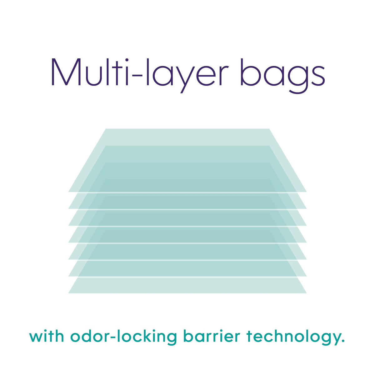 Q: What features help control odors in the Litter Genie Easy Roll system?A: The Litter Genie Easy Roll system utilizes multi-layer refill bags with odor barrier technology that effectively locks away odors from soiled cat litter for up to eight days for one cat.