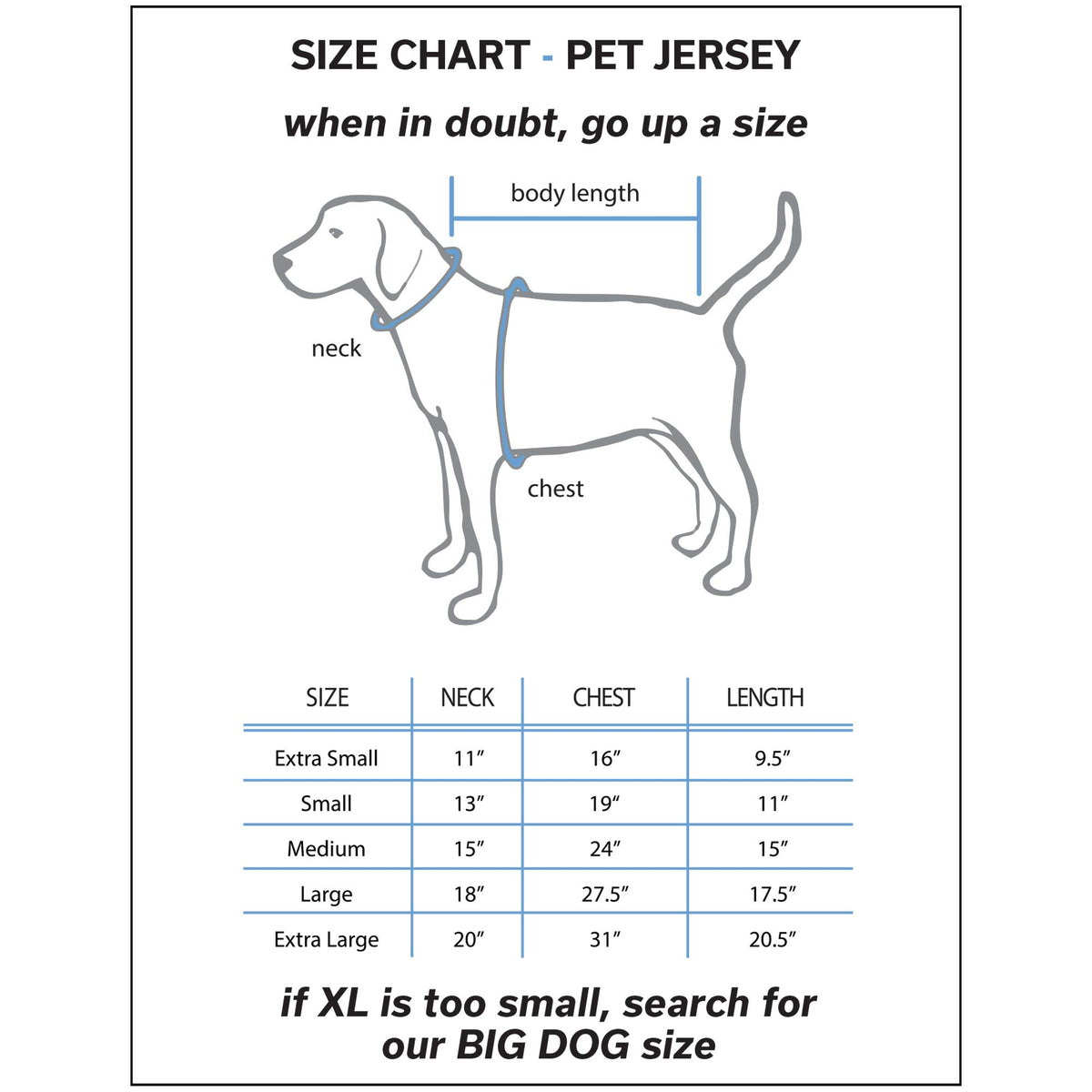 Your dog is your most loyal fan. So let them be loyal to your favorite team too in a pet jersey by Littlearth Productions. Our jerseys are a soft fabric and mesh with a colorful team screen print on the back and sleeves. The woven shield is sewn on the front neck line and a locker tag is sewn on the back bottom of the jersey for that game day feel. These jerseys are officially licensed and made from 100% polyester. Machine washable.