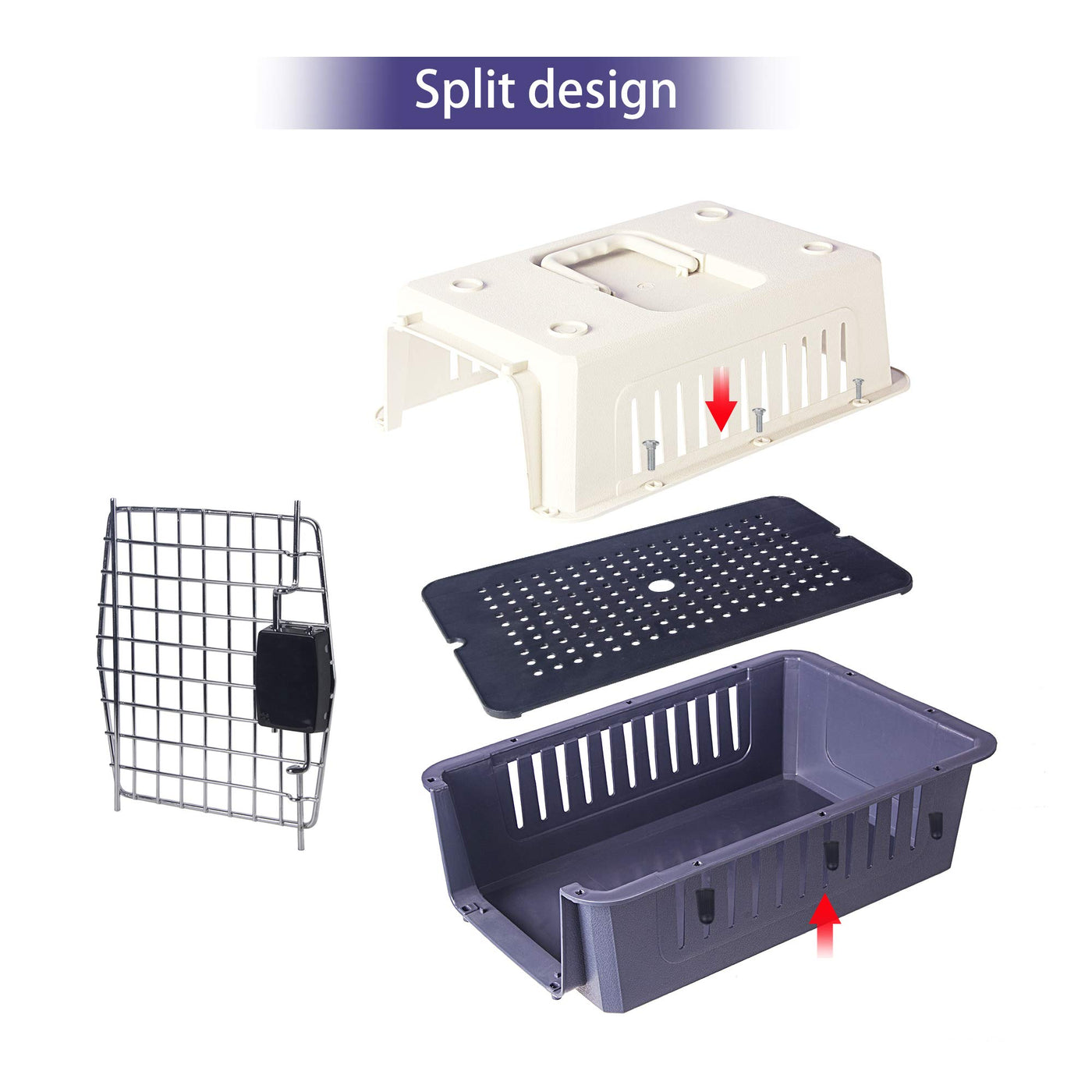 Material:Plastic,Steel. Color:red,darkblue. S dimension:15.7*11.8*9.8in;weight:3.3lb. M dimension:20*14*14in;weight:5.5lb. L dimension:24*16*16in;weight:8.8lb. Constructed of sturdy yet stylish heavy-duty plastic, the steel wire and plastic combine for strength, safety, and visibility. Made of durable palstic with a steel-wire front door. Spring-loaded latch for smooth opening. You can use it for air travel or car travel with your lovely pet. Your furry friend will enjoy superior ventilation and visibility.