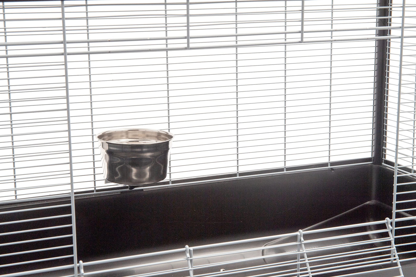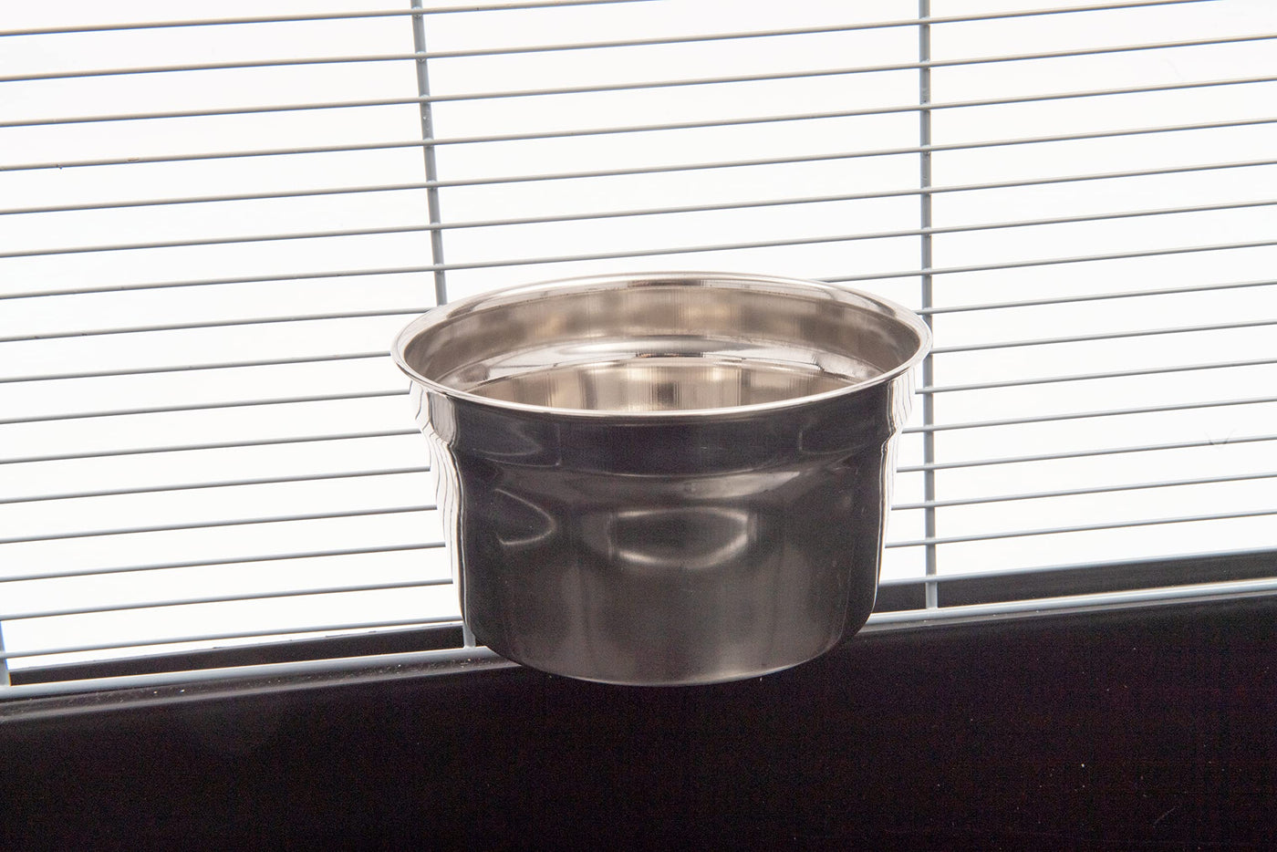 The radical steel stainless crock is a tough, rust and corrosion-resistant premium stainless steel and will not absorb food odors. Mouth is wider than bottom to reduce spilling. Base is made of thick, chew-resistant plastic. Bracket has ridges and fits securely on most cage bars, whether horizontal or vertical.