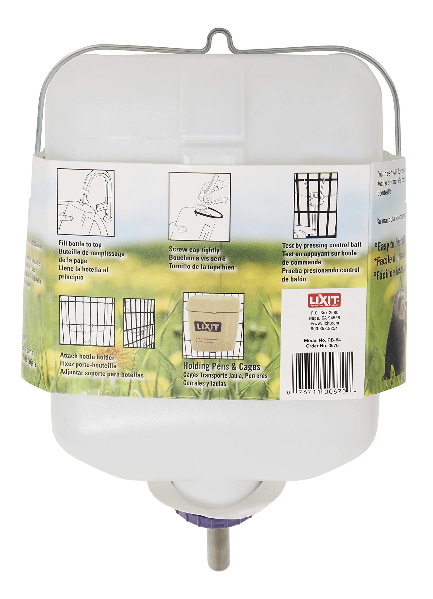 Lixit wide mount bottle for easy filling or cleaning and includes a stainless steel double ball-point tube. Durable, heavy duty, weather resistant bottle. Ideal for ferrets, guinea pigs and rabbits, use on outdoor cages. Comes in 64-ounce capacity. ''All normal bottles (excluding top fill) have to be filled completely full. Yes they need to check for the yellow gasket. Ideally, they fill completely full, tighten cap, BEFORE, turning over to hang they should squeeze bottle slightly and force a small spurt of water out. Then turn over to hang. It is very important that the support wire and the bail wire are both used. If a customer just rests on a wire there is too much weight on the neck of cap and it will allow air in.''