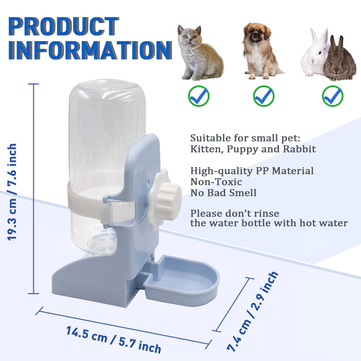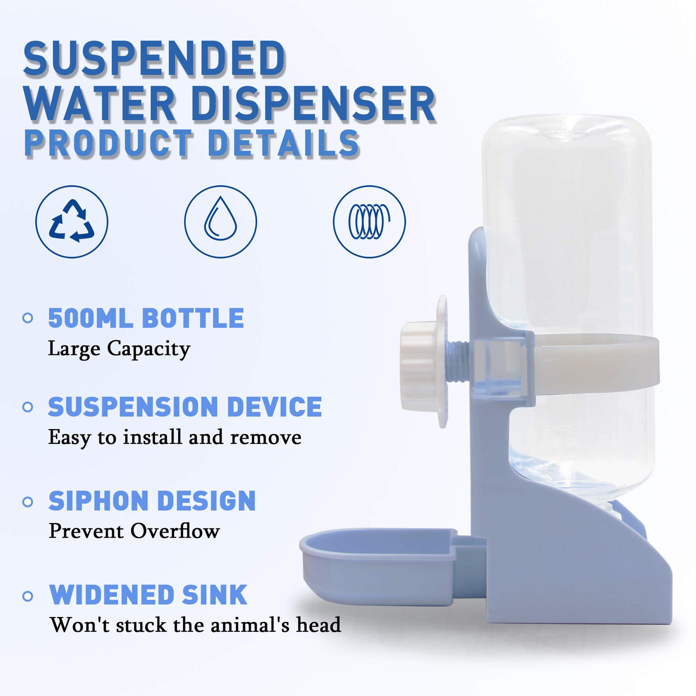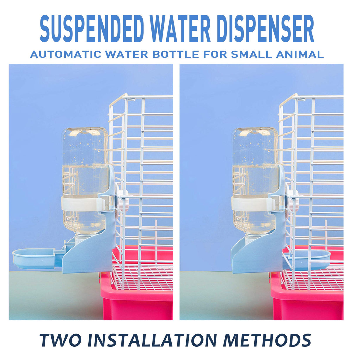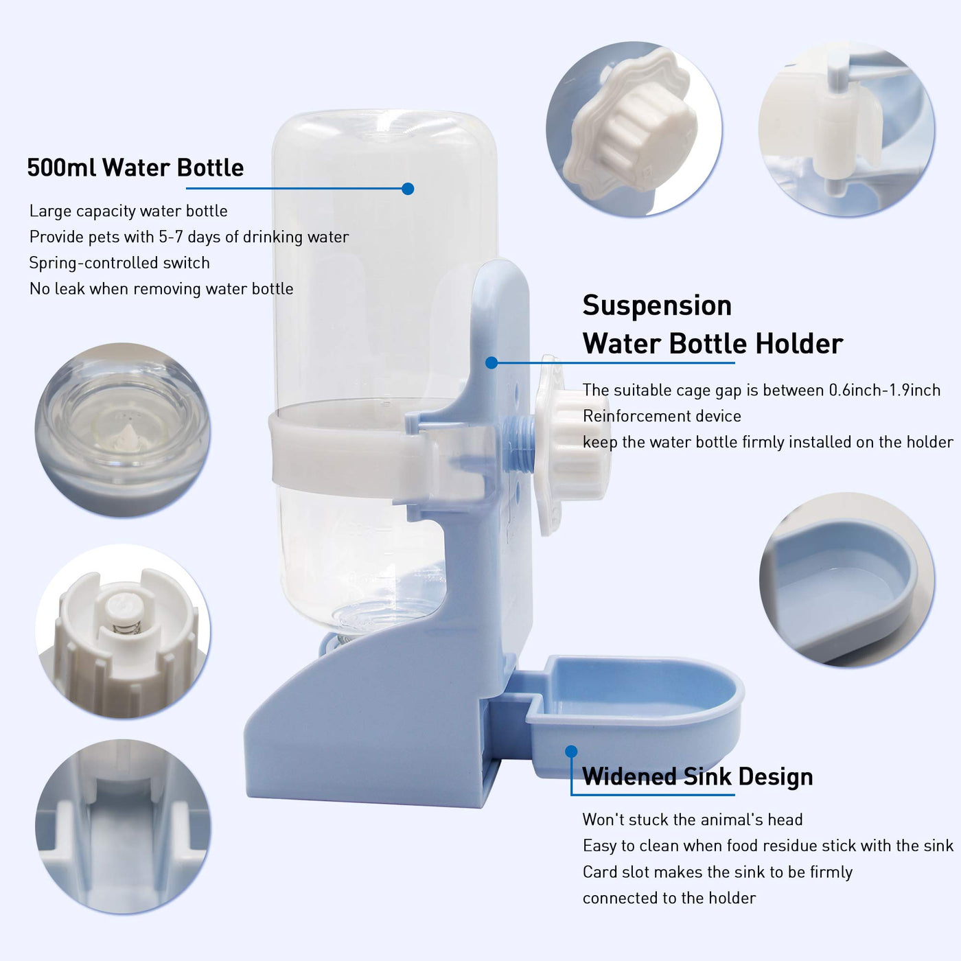 BREEDER MUST HAVE IT WHEN gOINg OUT 500ml water bottle can provide your small pet with water for 3-7 days The clear scale on the surface of the bottle makes you easy to observe pets water intake and prepare plenty of water ready for pet until you get back Suspension holder keeps water bottle being installed on the cage firmly avoid the risk of dehydration caused by pet overturns the water bowl TWO WAYS TO INSTALL IT How to make it easy for small pet to drink water when playing outside the cage Simply remove the water bottle and sink adjust the orientation of the sink and install them on the holder again When your pet needs water they can quickly absorb water without having to return to the cage or even avoid drinking the contaminated water on the ground OBVIOUS ADVANTAgE OF gRAVITY FLOW The cap is equipped with a spring When the water bottle is connected to the sink the cap is opening and the water will flow into the sink by gravity but will not overflow The water in the sink will not return to the bottle this ensures that the water in bottle is clean Water in common water bowl is easy to be polluted by pet pet will get sick after drinking WIDE SINK DESIgN compared with stainless steel straw style water bottle pets make less noise drinking directly from the sink Pets dont need to tilt their heads to drink which will reduce the damage to their neck The petAs lips can be immersed in the sink and touch water this will satisfy the lip skin and facial hydration needsThe smooth sink is easy to clean For your pets health please clean the water bottle and sink once or twice a week QUALITY AND SERVIcE SUPPORT Our products are made of high-quality materials harmless to your small pets (guinea PigRabbitBunnyFerretKittenPuppy) without any uncomfortable smell If you have any questions about our products or any problem after purchase including product damage caused during transportationPlease contact us we will provide you with a perfect solution within 24 hours