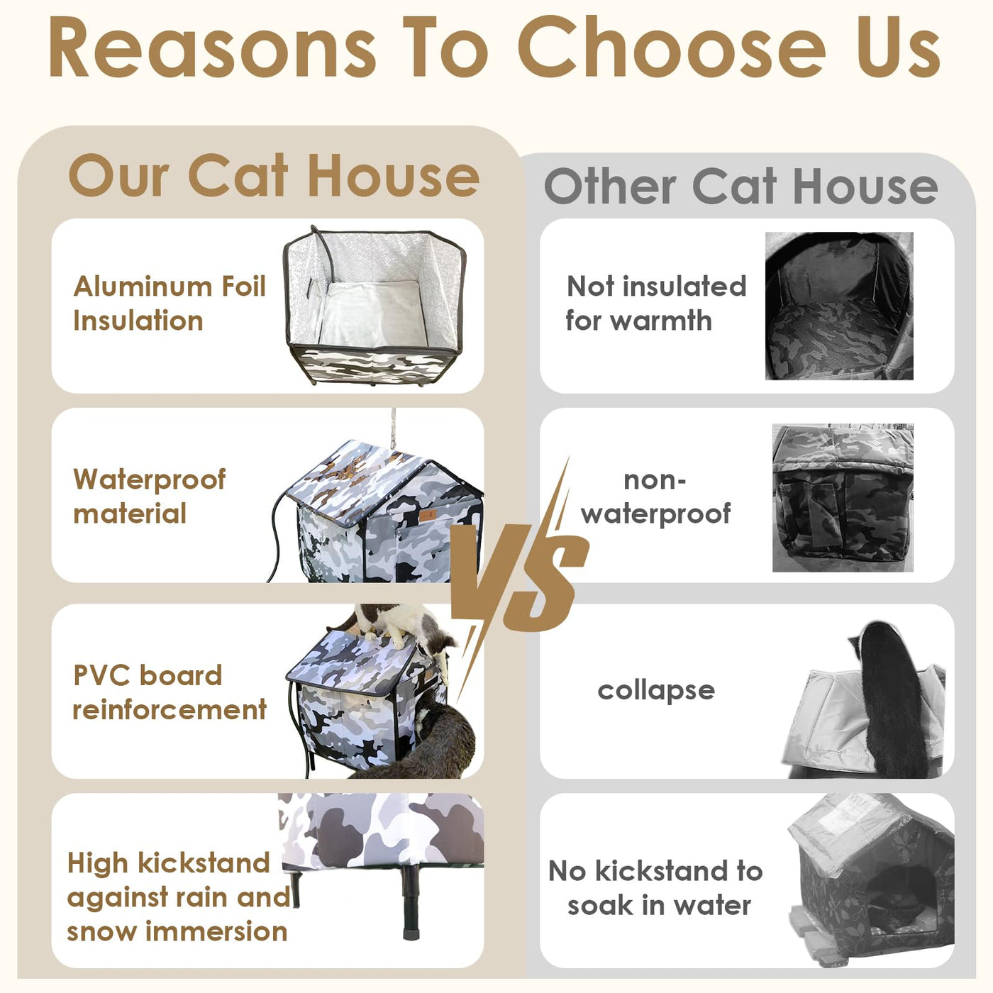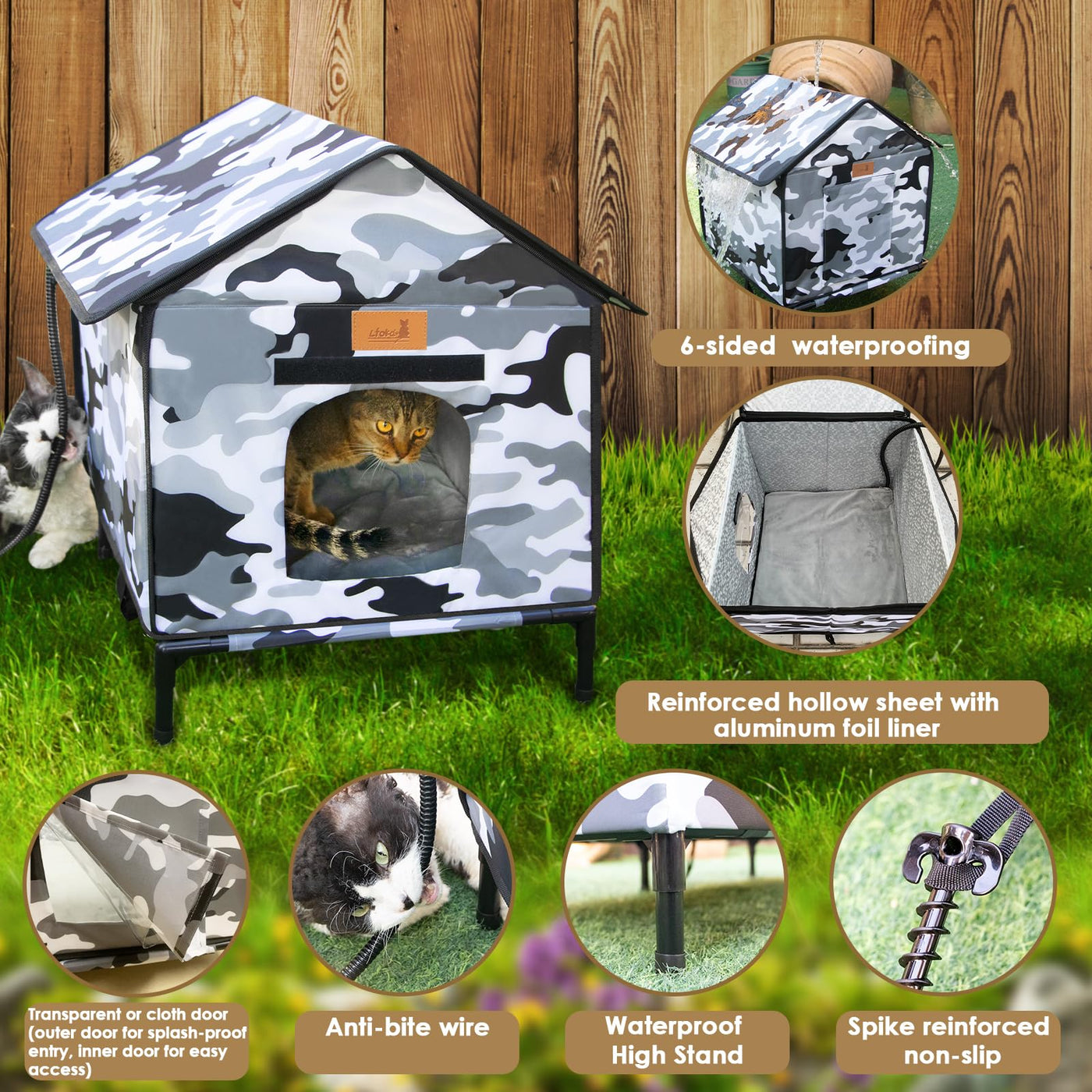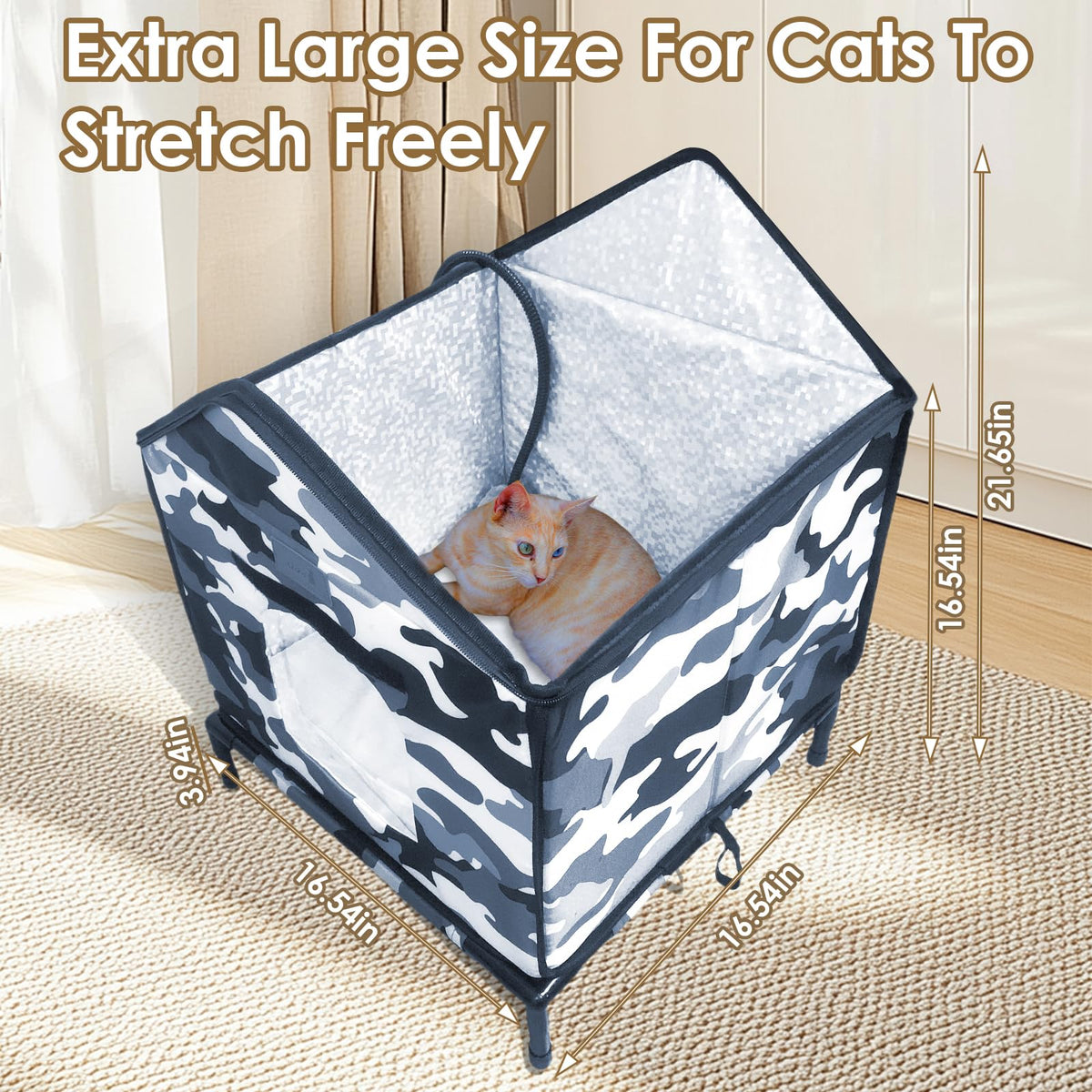 Weatherproof Design: Features A 66.93 Inches Chew-Resistant Cord, Waterproof 900D Oxford Fabric, And A Slanted Roof To Prevent Rain And Snow Buildup, While The Elevated Base Keeps Moisture Out.Insulated Comfort: The Six-Layer Pearl Cotton Walls And Aluminum Foil Lining Improve Heat Retention. The Tested Heating Wires And Waterproof Heating Pad Distribute Warmth Evenly Across The Entire Cushion, Ensuring High Safety And Keeping The Space Warm And Comfortable.Spacious Size: This Cozy Cat House Measures 16'' X 16'' X 21.26'', Making It Ideal For Balconies, Porches, Barns, And Gardens.Sturdy Construction: The Robust Frame Supports Up To 100 Lbs And Includes Four Long Stakes To Ensure Stability Even In Windy Conditions.Easy Maintenance: Tool-Free Assembly With A Hinged Roof For Quick Installation And Removal, Plus A Removable Waterproof Base For Effortless Cleaning.