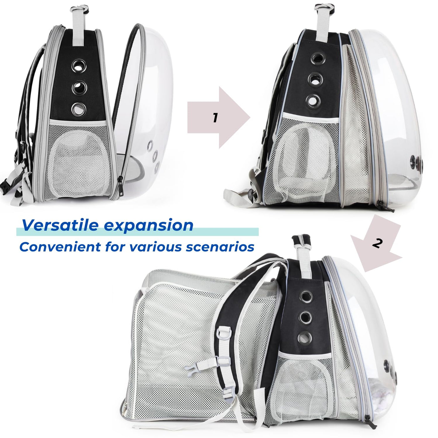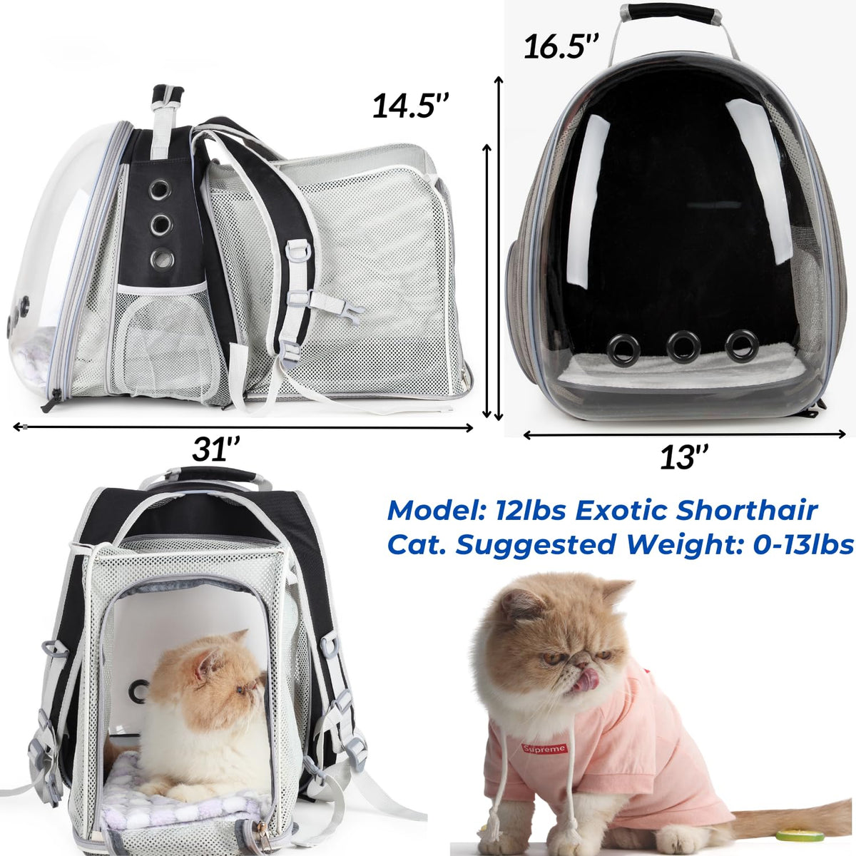 Introducing The Ultimate Cat Backpack Carrier - Your Go-To Choice For Pet Travel On The Go! Our Carrier Is Perfect For Cat Owners Who Love Taking Their Furry Friends With Them Everywhere They Go. Measuring At 13'' L X 14'' W X 16.5'' H, Expanded Size 13'' L X 30.5'' W X 16.5'' H; Fits For Cats And Small Dogs Up To 13 Lbs.This Backpack Offers Plenty Of Room For Small Pets, Including Cats And Puppies. This Backpack Combines Safety, Comfort, And Convenience To Provide Pet Owners With The Most Hassle-Free Travel Experience Possible. The Backpack Features A Clear Window That Allows Your Pet To Enjoy Watching The World Go By, While 9 Large Ventilation Holes Ensure That They Stay Cool And Comfortable At All Times. But That'S Not All - Our Backpack Is Expandable, Providing Doubled Space For Your Pet To Stretch Out And Move Around. Plus, One Side Door And A Pocket In Anti-Scratching Net Material Make It Easy For You To Take Your Pet In And Out, And The Backpack Even Comes With A Mini Fan That Fits Neatly Into The Pocket, Keeping Your Pet Cool During Hot Weather. This Backpack Carrier Is Perfect For A Variety Of Travel Situations, From Hikes And Trips To The Pet Hospital To Travel On Airplanes, In The Car, Or On A Bike. And Once You'Re Back Home, Cleanup Is Quick And Easy, Thanks To Its Lightweight Design And Easy-To-Clean Materials. So Why Wait? Buy Our Front Expandable Cat Backpack Carrier Today And Give Your Furry Friend The Gift Of Comfortable Travel!