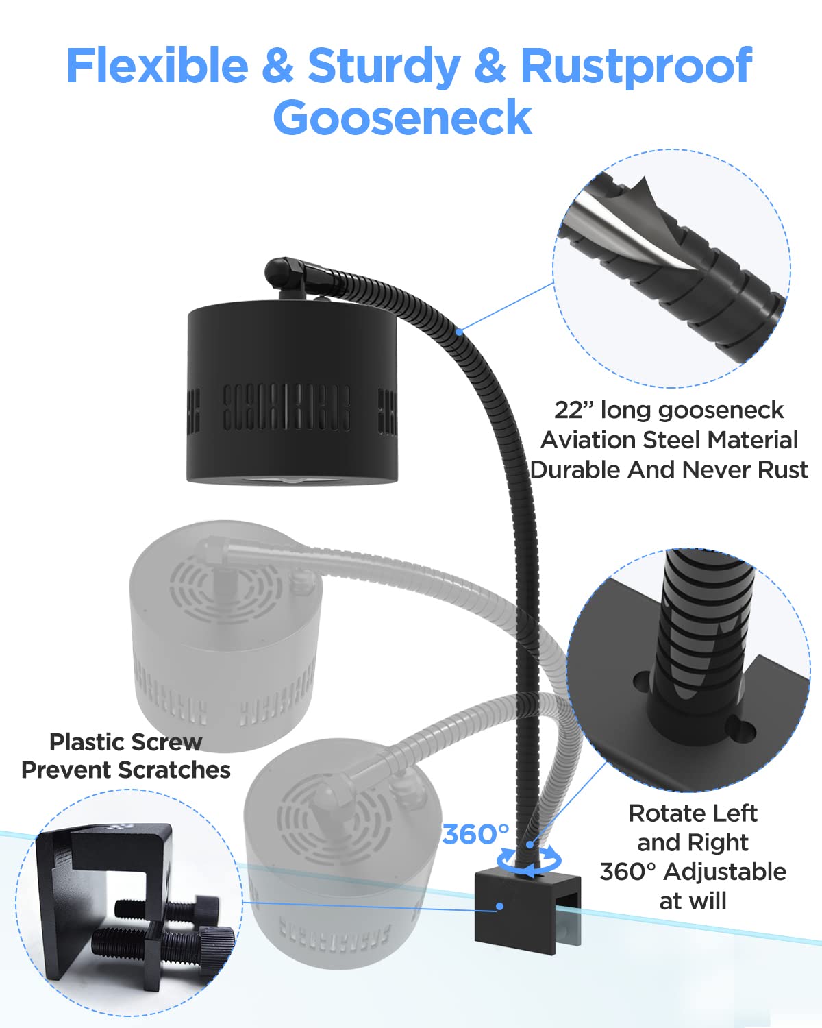 *Solid aluminum housing *Dimmer controller, easy operation *Bendable rustproof gooseneck *COB LED with good color rendering index brings bright and natural sunlight