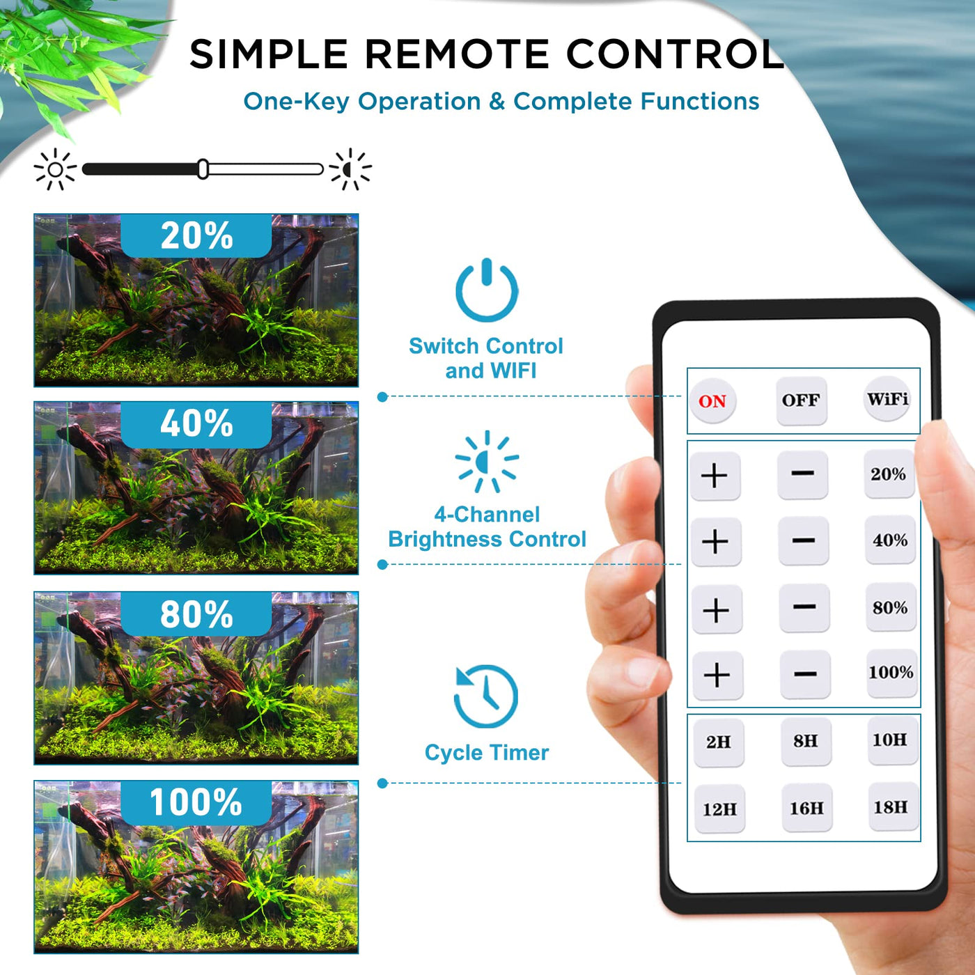 Q: How does the dimmer function work on this aquarium light?A: The Asta 120 features a versatile adjustment system that allows you to control brightness through a remote, manual dimmer, or a smart controller, enabling precise lighting adjustments for your aquatic environment.