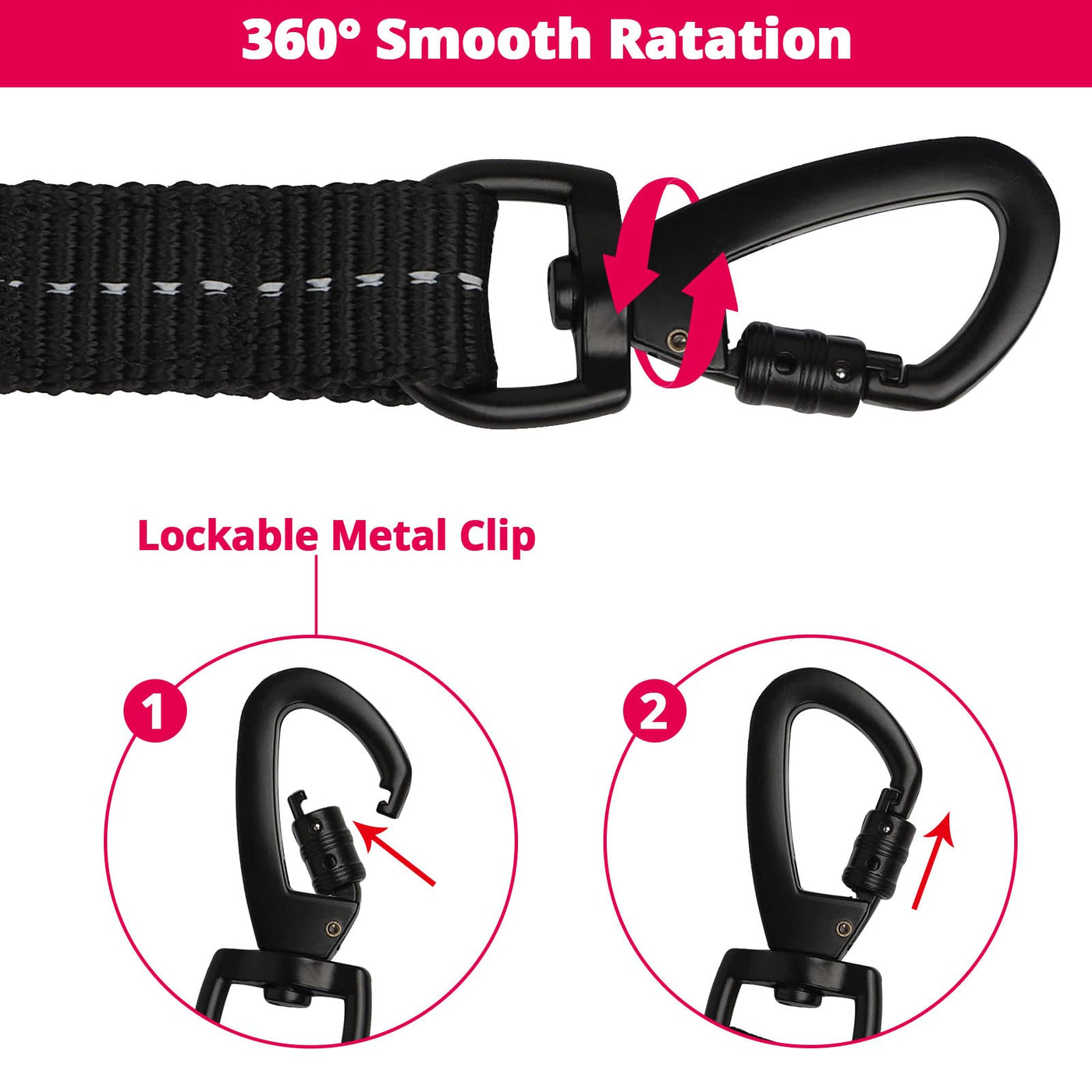 Q: How does the upgraded 360° swivel lockable hook work?A: The upgraded 360° swivel lockable hook prevents the leash from twisting and tangling, allowing your dog to run freely while maintaining your control.