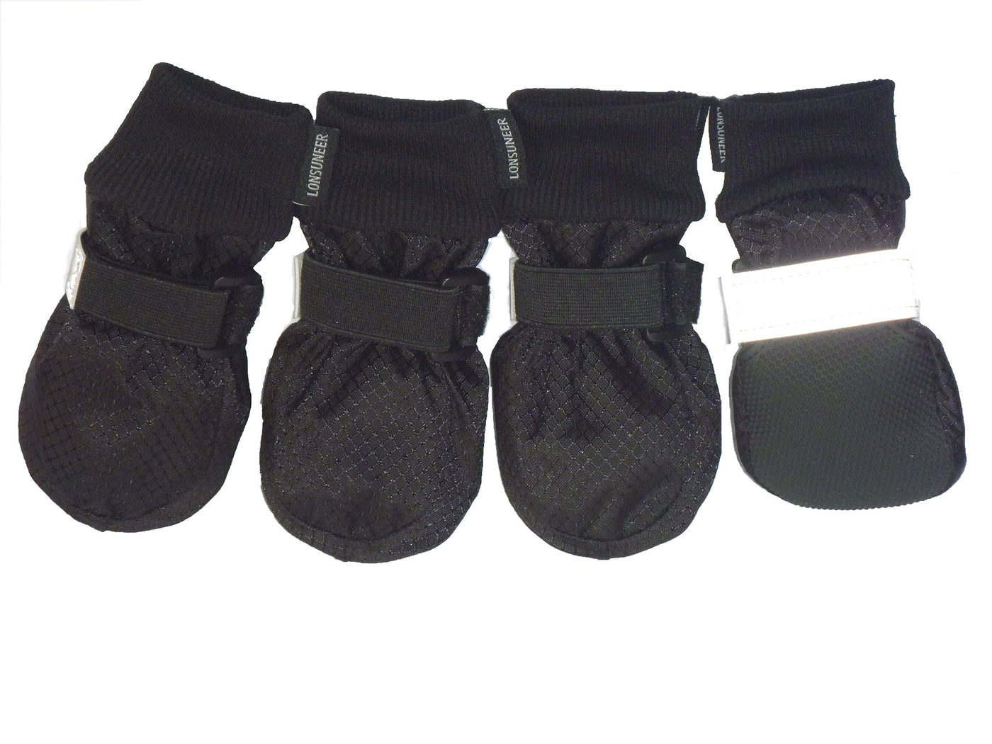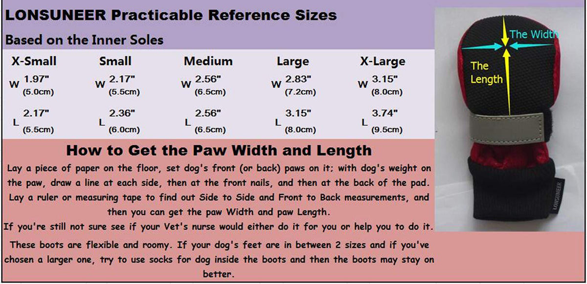 Practicable Reference Size of Small: Inner Sole Length 2.36 Inch, Inner Sole Width 2.17 Inch. Lonsuneer dog boots are paw protectors for dogs, capable to protect paws indoors and outdoors, lightweight, sturdy and hand washable. Please measure across the whole paw pad to get the paw width and length. For these boots, a snug fit is better. If your dog's paws are in between 2 sizes and if you've chosen the larger one, you could kindly try to use socks for dog inside the boots and then the boots may stay on better. Though the soles are waterproof, the boots can not be applied in deep water, because there may be water seepage through sewing holes when soak in deep water.