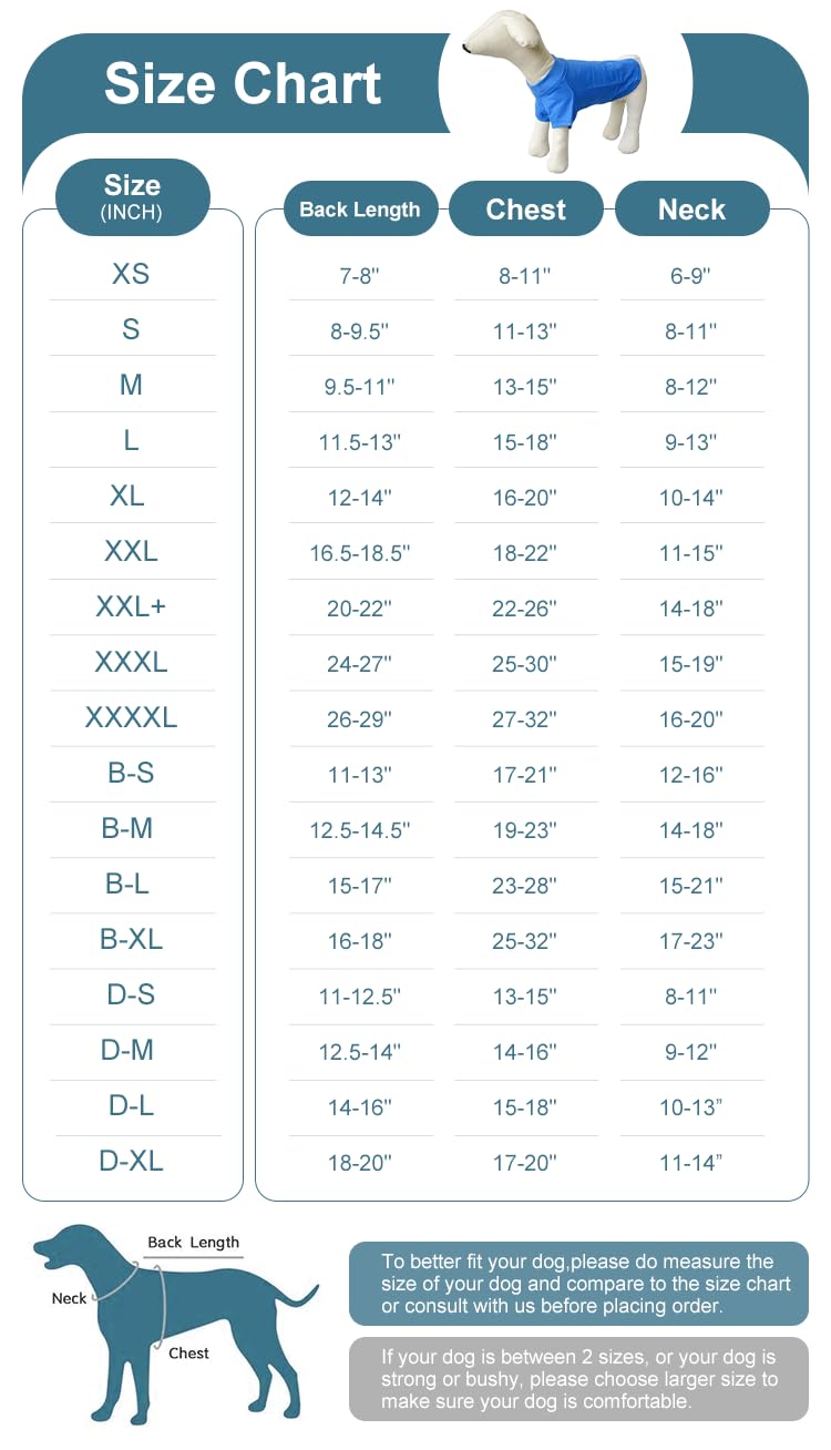 To Meet Customer'S Requirements, New Size Xxl+ (Between Xxl And Xxxl) And Bulldog Size (B-S To B-Xl) Will Coming Very Soon2019 Best Gift For Your Dogs Made Of Soft, Breathable And Skin-Friendly Cotton With Better Ventilation, Our Pet Costume Will Provide Added And Extra Fashion And Coziness To Your Pet'S Wardrobe. Just Let Your Dogs Be Trendsetters Now. Features: High Quality Cotton, Soft, Breathable And Comfortable. 17 Sizes Can Be Chosen, Design For Small/Medium/Large/Bulldog/Dachshund Dogs. 18 Colors, Classic Dog Costume, Make Dogs More Attractive. Keep Dogs Warm In Cold Winter. Easy To Wash, Keep Your Dogs Tidy All The Day. Specification Material: 100% Cotton Type: Pet Costume Size Chart: Xs: Length 7-8'',Chest 8-11'', Neck 6-9'' S: Length 8-9.5'',Chest 11-13'', Neck 8-11'' M: Length 9.5-11'',Chest 13-15'', Neck 8-12'' L: Length 11.5-13'',Chest 15-18'', Neck 9-13'' Xl: Length 12-14'',Chest 16-20'', Neck 10-14'' Xxl: Length 16.5-18.5'',Chest 18-22'', Neck 11-15'' Xxl+: Length 20-22'',Chest 22-26'', Neck 14-18'' Xxxl: Length 24-27'',Chest 25-30'', Neck 15-19'' Xxxxl: Length 26-29'',Chest 27-32'', Neck 16-20'' B-S: Length 11-13 , Chest 17-21 , Neck 12-16 B-M: Length 12.5-14.5 , Chest 19-23 , Neck 14-18 B-L: Length 15-17 , Chest 23-28 , Neck 15-21 ;B-Xl: Length 16-18 , Chest 25-32 , Neck 17-23 D-S: Length 11-12.5 , Chest 13-15 , Neck 8-11 D-M: Length 12.5-14 , Chest 14-16 , Neck 9-12 D-L: Length 14-16 , Chest 15-18 , Neck 10-13 ;D-Xl: Length 18-20 , Chest 17-20 , Neck 11-14 ;Please Measure Your Dog'S Size And Choose The Correct Size Before You Have The Order.