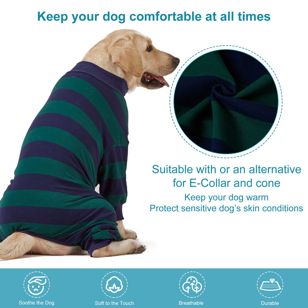 Lovinpet Large Dog Pajamas Bodysuit - Lightweight Stretchy Knit Pullover Dog Onesie, Green And Black Stripe Print Dog Shirt, Uv