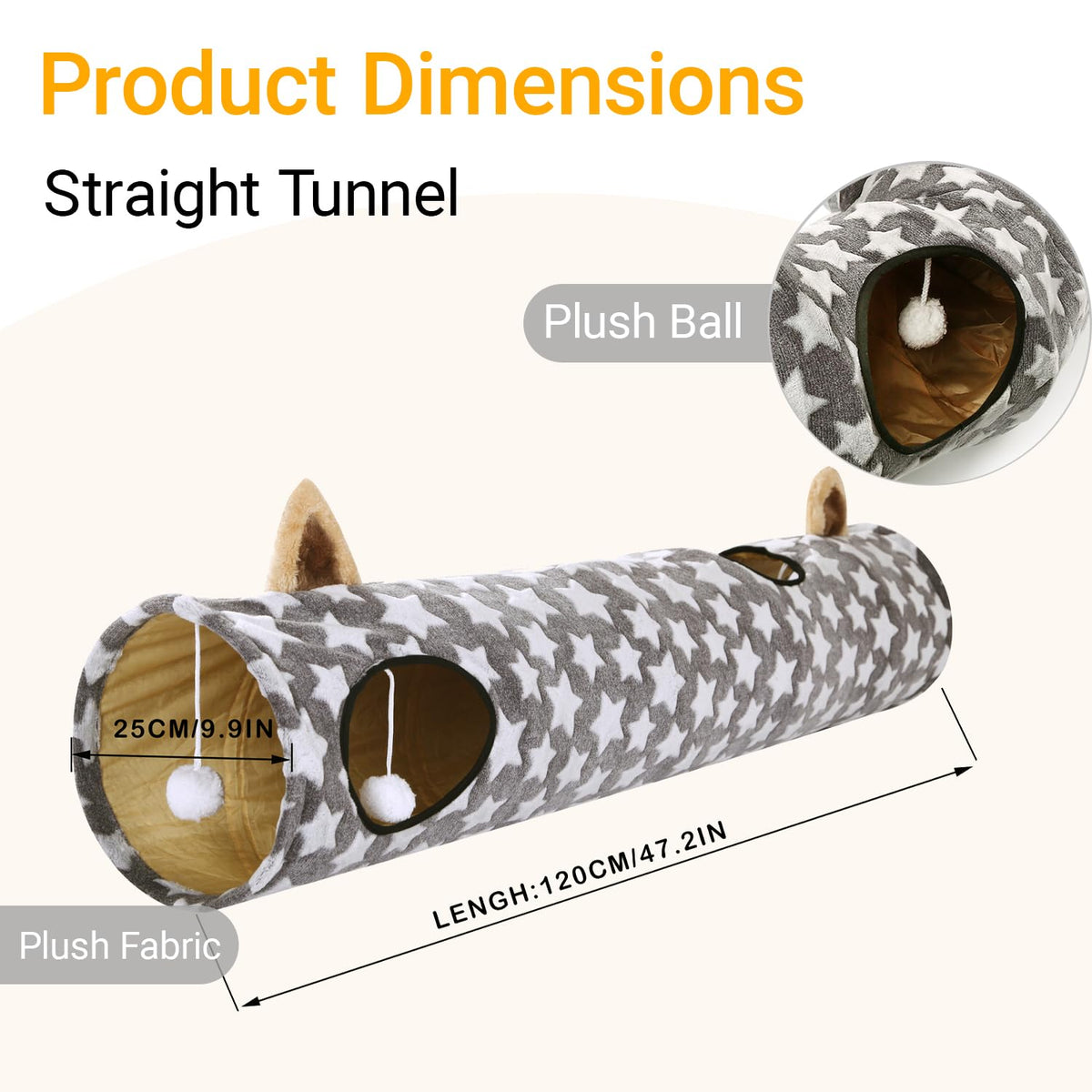 Luckitty Cat Tunnel -Straight-Shaped, Gray Star Pattern, Soft Velvet Exterior, Oxford Fabric Fog-Proof Interior, Plush Toy Ball,