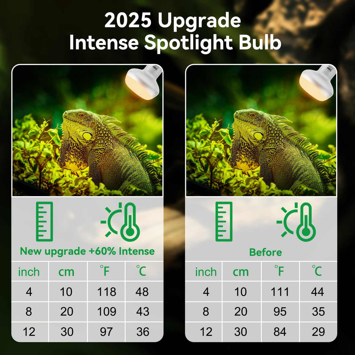 Is your reptile pet suffering from a loss of appetite and dull skin color? This means that it lacks the necessary UVA light and heat. In nature, reptiles use sunlight to increase body temperature and regulate physiological functions. As for indoor breeding reptile pets, because the lack of enough light, they are not provided with an appropriate environmental temperature, there's the trouble of developing chronic diseases. The addition of our heat lamp bulbs solve this problem for reptiles.Welcome to our new flat-bottom basking light for reptiles, an impressive new model that combines luxury with functionality.Our reptile basking bulb can simulate the closest to natural sunlight, and newly added a 30-degree angle luminous design, which can gather 30% more UVA light and heat than ordinary heat lamps. It can quickly heat up the temperature of the terrarium and create bright light like the sun, forming the best sunbathing environment. Thereby promoting the appetite, digestion and metabolism of reptiles, keeping them healthy.At the same time, the silver appearance gives it a unique sense of luxury, so that your reptile pet breeding environment is more refined and noble. The flat bottom design provides greater capacity for the interior space, allowing for a more even distribution of the temperature inside the heat bulb to extend the life of the reptile heat bulb and reduce the risk of bursting. Buy our flat-bottom reptile heat lamp and you'll get a top-of-the-line product that combines luxury with efficient features. Not only does it provide a warmer area, but it also has excellent safety and life extension features. This heat lamp bulbs for reptiles will provide a comfortable, warm and safe home for your reptile pet. 2 pack design whether as a spare replacement or to meet the needs of multiple feeding environments, our products meet your needs. Make sure your pet gets constant warmth and comfort.Give your pet our heat lamp, your pet deserves the best.