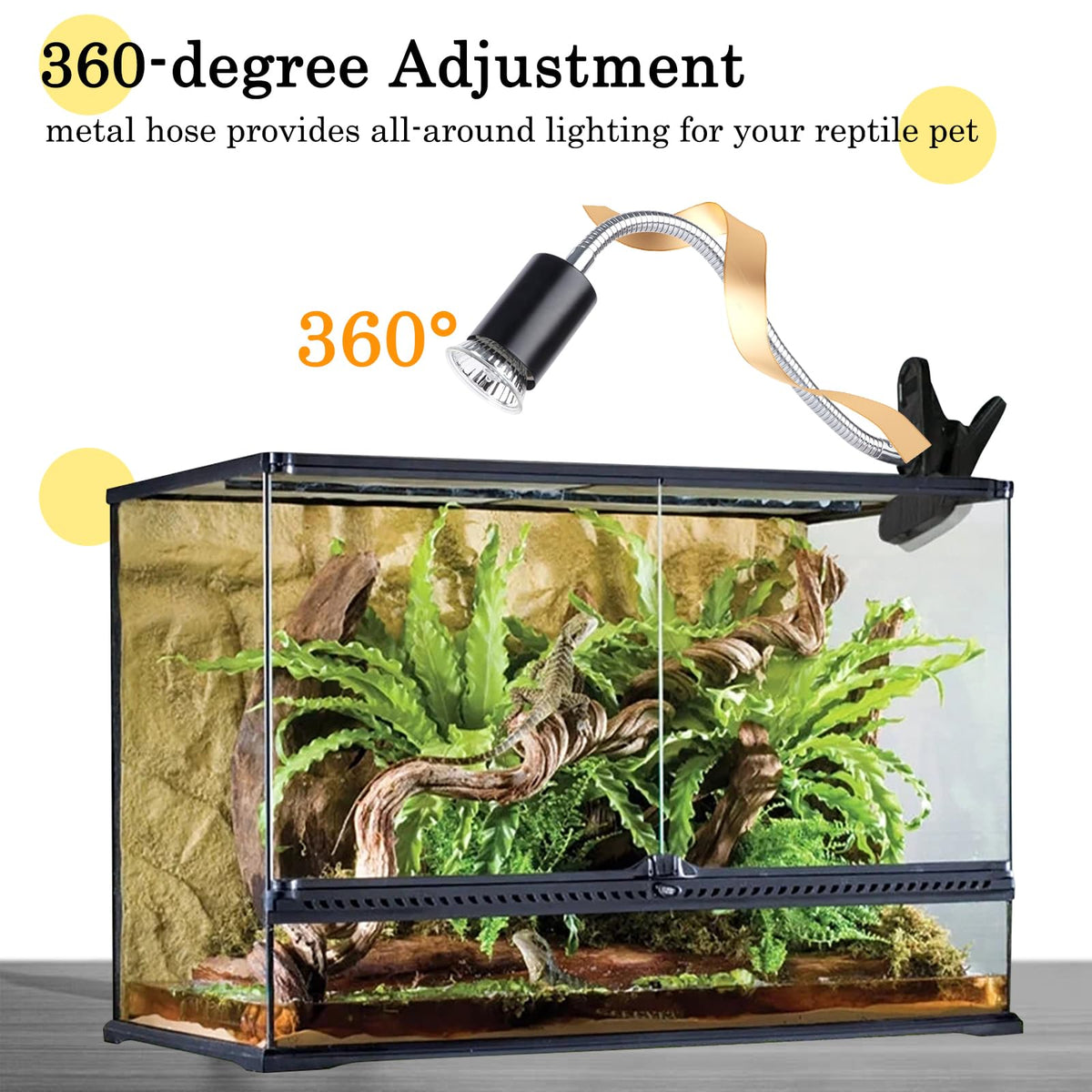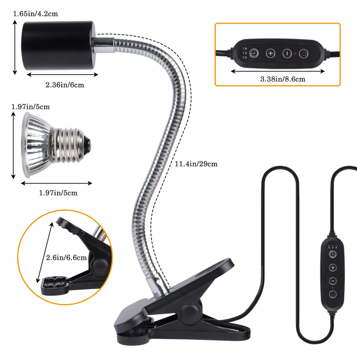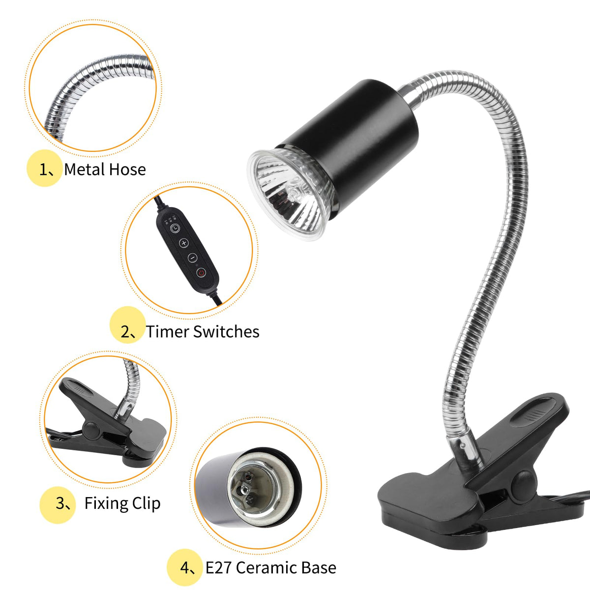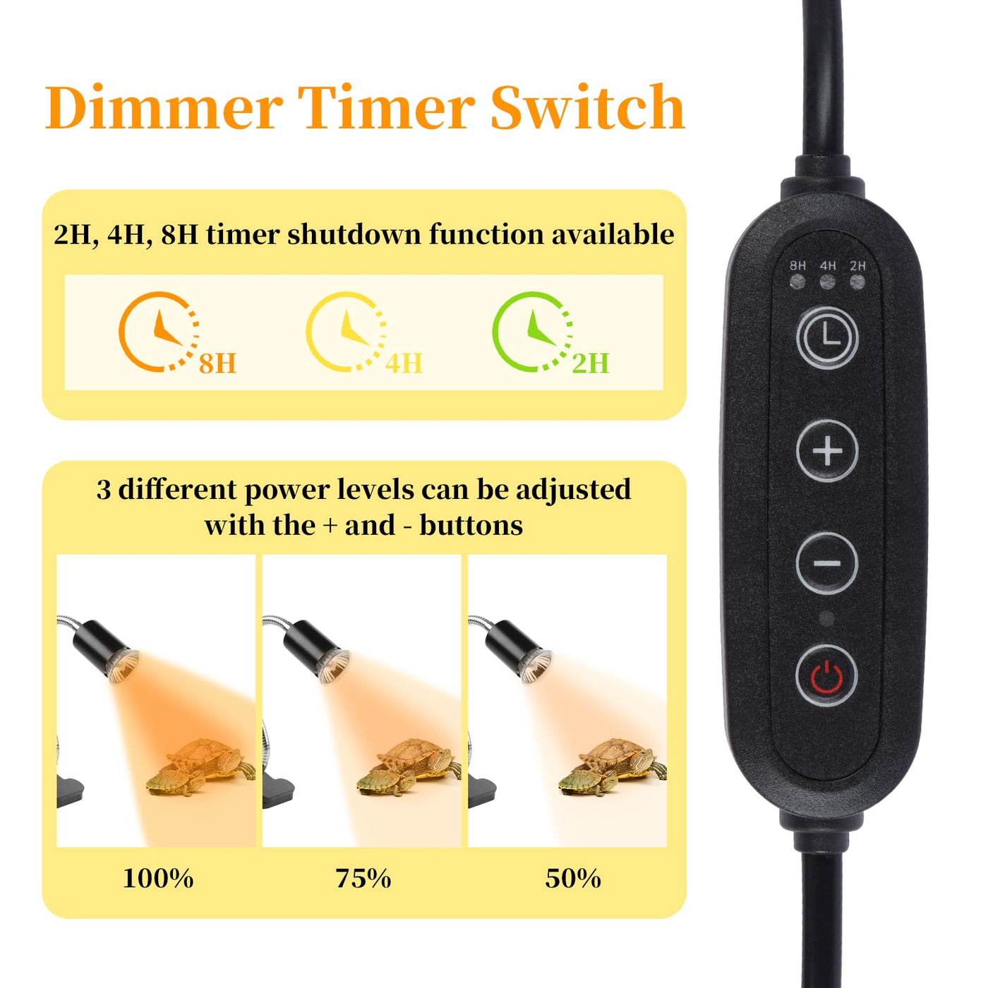 Our High Quality Heat Lamp Is The Perfect Heating And Lighting Solution Tailored For Reptile Keeping Enthusiasts. Equipped With +/- Buttons To Adjust Brightness And Temperature, You Can Precisely Control The Output Of The Bulb According To The Needs Of Different Reptiles. The Built-In Timer Function Allows You To Easily Set The Heating Duration For 2, 4 Or 8 Hours, Ensuring That The Reptiles Get Constant Heat For The Right Period Of Time, Reducing The Tediousness Of Human Operation And Providing A Smarter Rearing Experience. Two 50W High Efficiency Uva Uvb Bulbs Are Included With The Product. The Heat Bulbs Have A Long Life Span And Evenly Distribute Light And Heat To Provide The Best Living Environment For Reptiles.