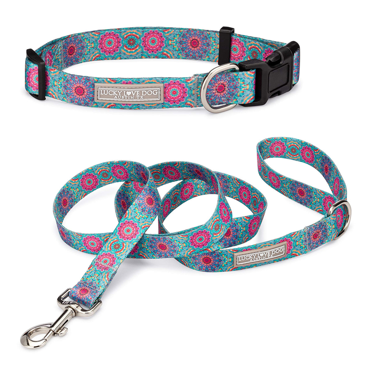 Lucky Love Dog, Boho Chic Matching Dog Collar And Leash Set, Vivid Pink And Turquoise Collar And Leash For Dogs, Soft, Adjustabl