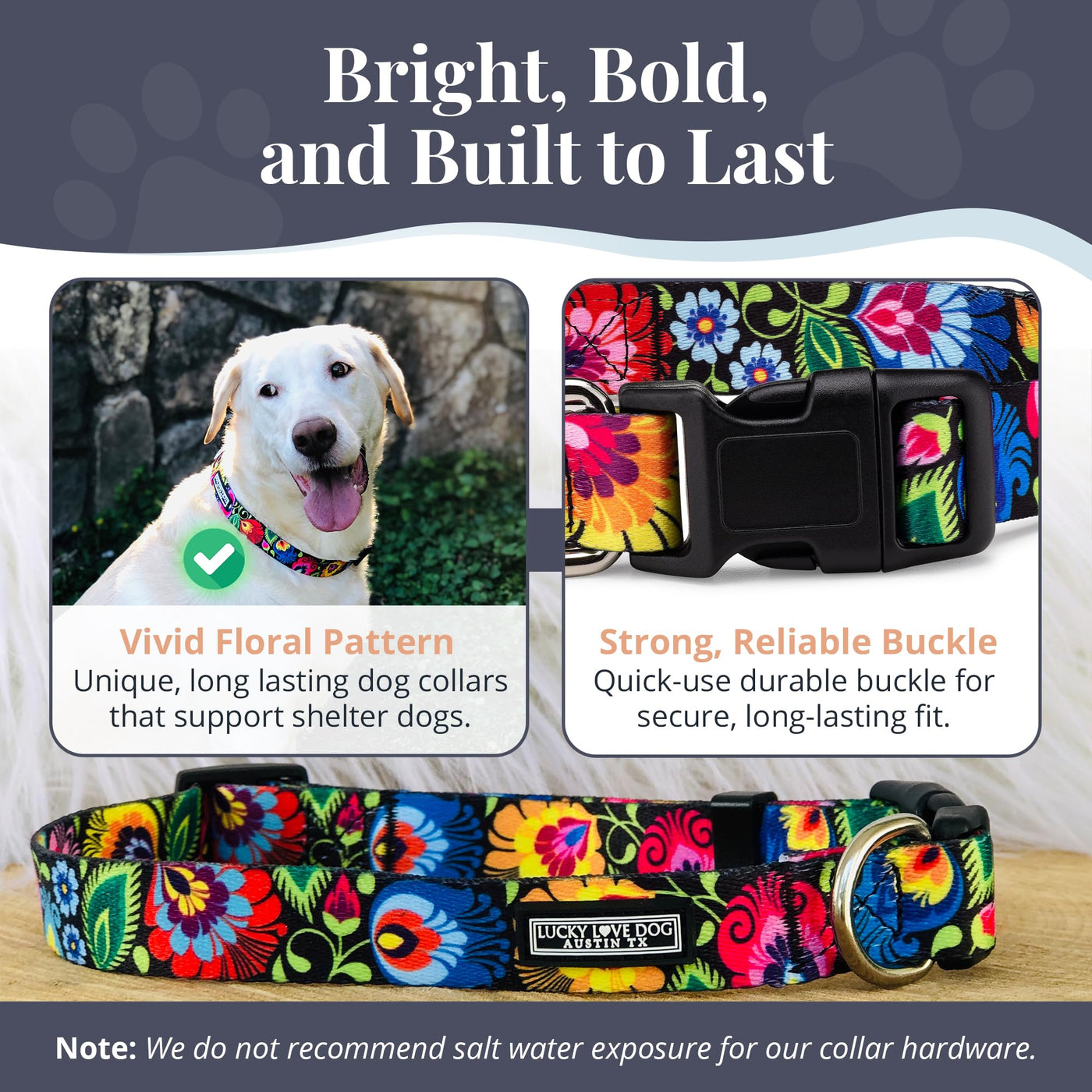 Q: What makes Lucky Love Dog Collars different from other collars?A: Lucky Love Dog Collars stand out due to their bright floral designs, commitment to helping shelter dogs, and the unique rubber tag that signifies purposeful shopping.