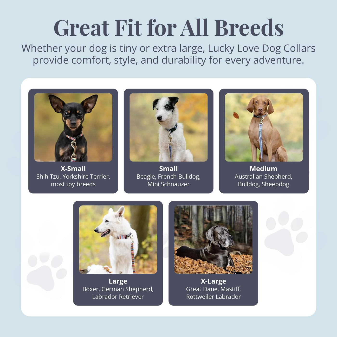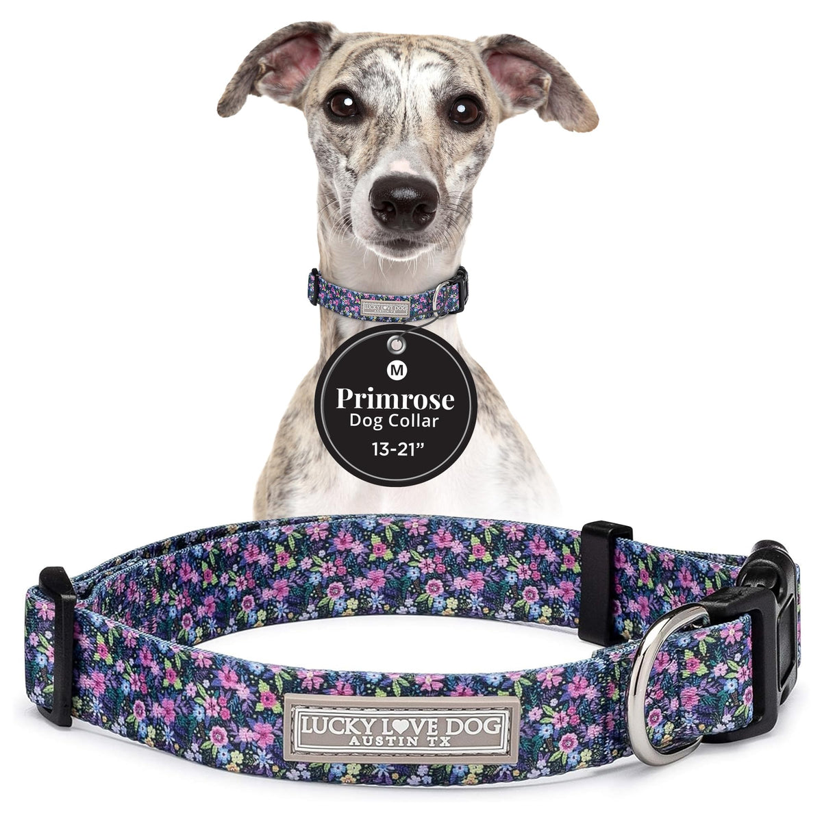 Q: What sizes does the Lucky Love Dog collar come in?A: The Lucky Love Dog collar is available in several sizes to fit a range of medium dogs. The sizes include XXS (6.5-9.5 inches), XS (7-11 inches), SMALL (10-15 inches), MEDIUM (13-21 inches), and LARGE (15-25 inches). Make sure to measure your dog's neck to find the perfect fit.