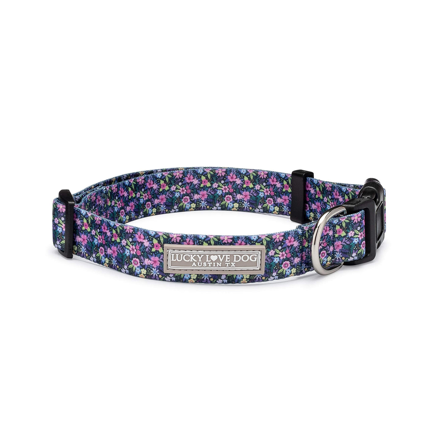 Lucky Love Dog, Comfortable, Soft, Cute Female Dog Collar For Medium Dogs, Black & Purple Floral Print, Adjustable Nylon Collar,