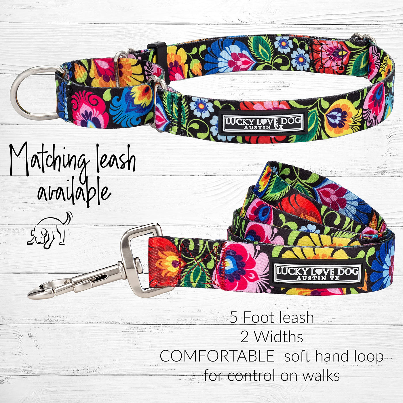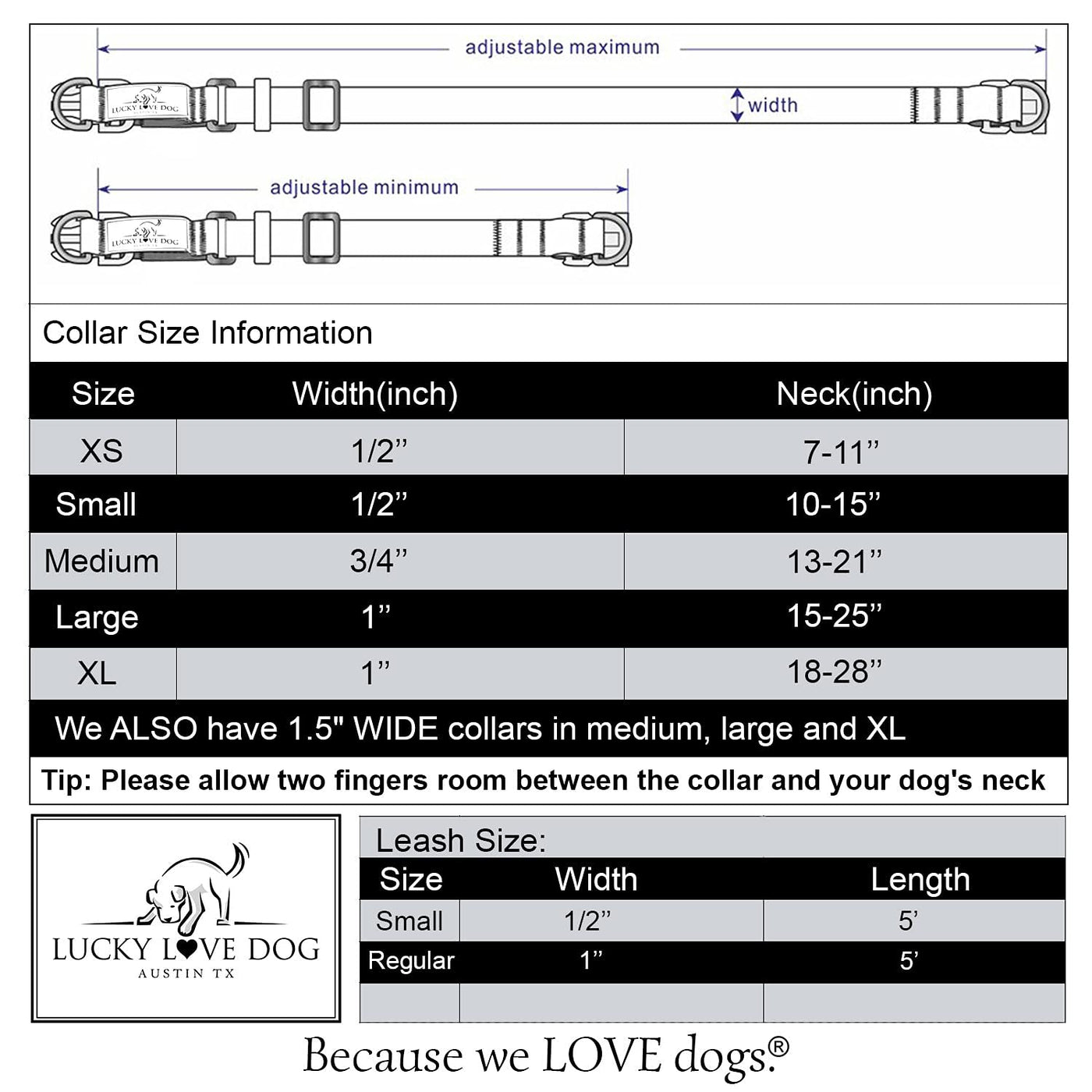To ensure you order the correct size for your dog PLEASE MEASURE your dogAs neck before ordering a collar You can use a soft tape measure or use a string and measure it with a ruler - this will ensure you choose the perfect size for your furry friend NOT to be left on your dog unattended Martingales are ONLY for walks OOKINg FOR AN EXTRA SPEcIAL MARTINgALE cOLLAR THAT STANDS OUT AND LOOKS gREAT ON YOUR DOg or PUPPY Lucky Love Dog specializes in designing unique vivid and stylish patterns that sayAI LOVE my dogl From teacups to giant breeds boy dogs or girl dogs we have a special collar pattern that will reflect your petAs unique personalityA And the best part A portion of each purchase helps save a shelter dog in need NO BUcKLE - martingale slips over dogAs head cONVENIENT & RELIABLE - MARTINgALE cOLLAR SLIPS OVER YOUR DOgAS HEAD & gETS YOU & YOUR DOg OUT THE DOOR QUIcKLY No buckles to worry about The Martingale is a comfortable alternative to a choke collar When your dog pulls the martingale creates tension & gives you better control Dogs are less likely to slip off the collar Durably constructed with a weatherproof D ring & HIgH DENSITY nylon Our soft & flexible collars are dog approved - they are super comfortable as well as long lasting YOUR LUcKY LOVE DOg PURcHASE WILL HELP SAVE A SHELTER DOg good newsA a portion of your Lucky Love Dog purchase is donated to help save a shelter dog For real We are a small business based in Austin and our mission is to save more dogs at shelters around the country Our founder has been a part of the rescue story of thousands of dogs - getting them out of shelters and into forever homes OOKINg FOR A MATcHINg cOLLAR+LEASH SET TO USE ON WALKS WeAve got you covered And youAre going to love the bright colorful options Our beautiful collars have matching leashes that are perfect for dog walking and hiking Leashes are 5 feet long with a comfortable soft hand loop that keeps you in control of your pooch Leashes come in two widths and can be purchased separately Browse our Amazon store for more options