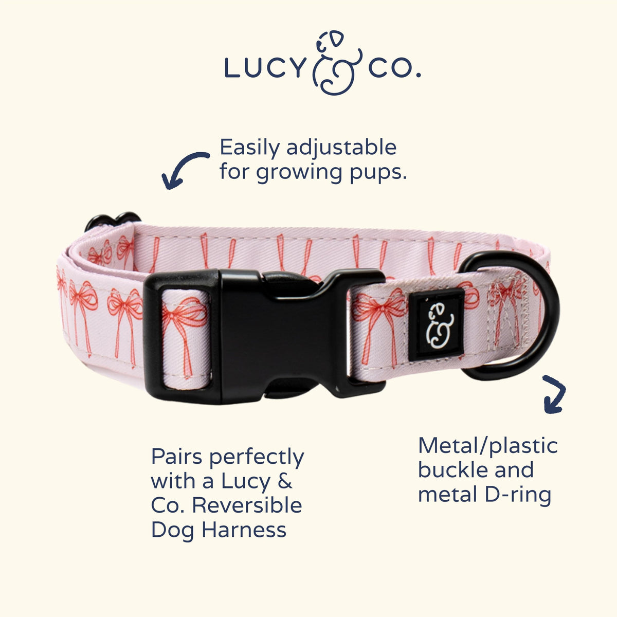 Lucy & Co. Ballet Bows Dog Collar - Durable Lightweight Designer Collar For Pets - Adjustable Metal Safety Buckle - White & Pink