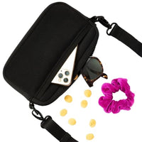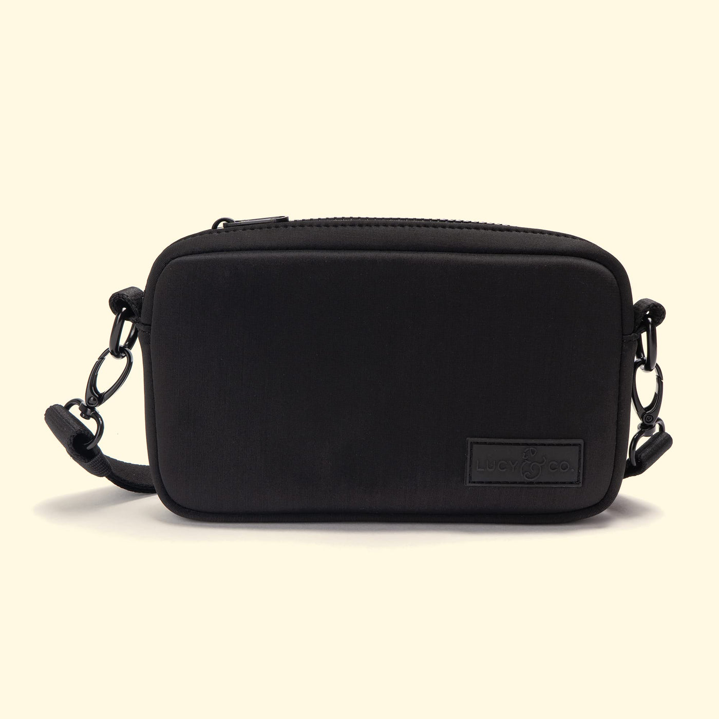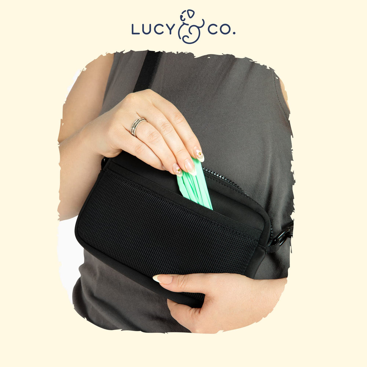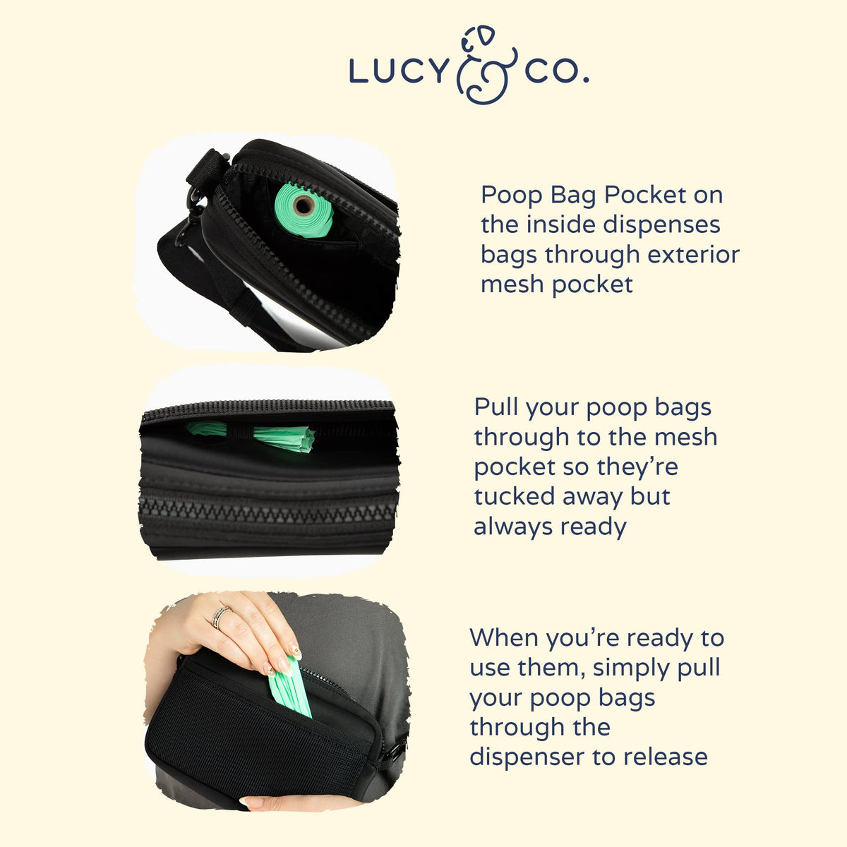 Bring your dog or pet to the beach, pool, or park, and keep all of the essentials with you. The Lucy & Co. Crossbody Treat Bag is the perfect way to keep your furry friend's treats close, poop bags ready and all of your gear at hand while on the go. The dog treat bag is great for rewarding or training your dog. Our dog treat pouch makes it simple to keep them pleased on daily walks and potty adventures. It stores plenty of treats, kibbles, and other necessities for walks. It features a zippered main compartment that's wide enough to hold treats, toys, and more. Its waterproof material keeps your furry friends' treats dry while you're out on those early morning walks with your pup. The pouch is shallow enough that you can reach the bottom with one hand. Interior pockets are designed for all your necessities. Carry your phone in a phone pocket that fits phones of all sizes. An internal D-ring to clip your keys or keychain. The front mesh pocket is perfect for incognito clean-ups, with a hiddent poop bag dispenser, and is ideal for clickers, keys, ID cards, and other small items. For sneaky cleanups, we built a hidden, built-in poop bag dispenser pocket that can easily hold any brand of waste bag. It is simple to use and remove waste bags. Save time by simply removing your next doggie poop bag from this poop bag holder when required. You'll really like the convenient built-in dog poop bag dispenser. Unlike other dog training treat bags on the market, the bag also has an adjustable strap to fit both men and women and can be worn over the shoulder, as a fanny pack or across the body, making it easy to keep your hands free while out with your pup. Our products are developed with the finest materials and functionality to truly simplify your life as a pet owner while providing all of the crucial features that your pets will appreciate. The bag is now available in two shades: black and lilac. The bag's machine-washable.