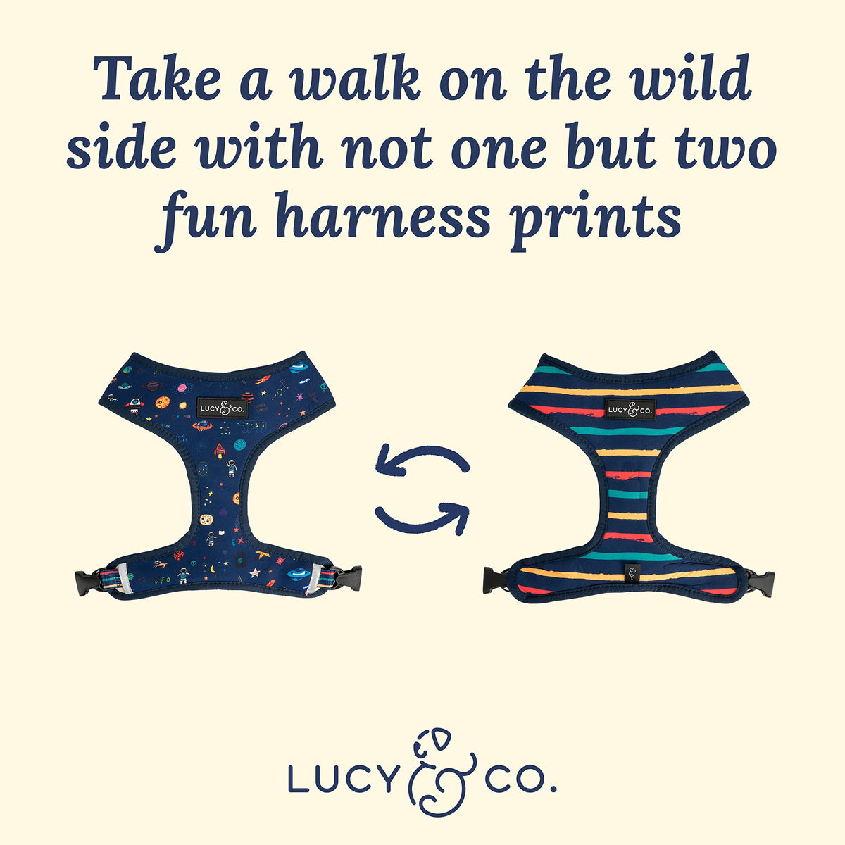Lucy & Co. Space Doodle, Cute Reversible Dog Harness Walking Halter - Best Designer Pet Harnesses For Medium Dogs - Padded Adjus