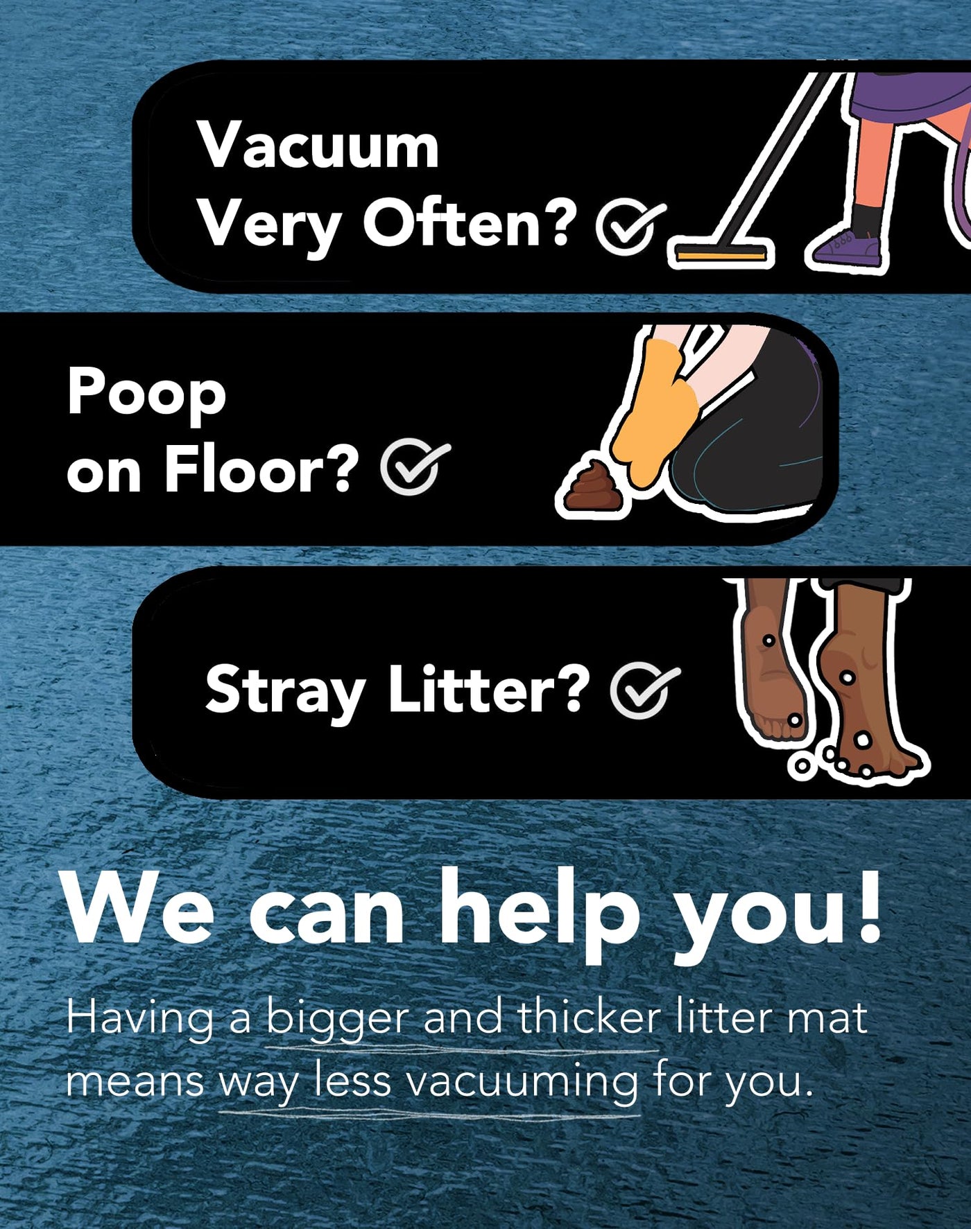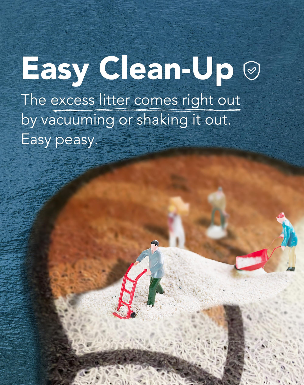 Introducing our litter mat: Designed for convenience. The unique geometric net structure captures stray litter, eliminating frequent emptying. Sized at 24'' x 32'' (60 x 90 cm), it offers unbeatable floor protection for single-entry litter boxes. Waterproof and anti-slip with easy clean-up. Premium quality, crafted with care in Toronto, cruelty-free.