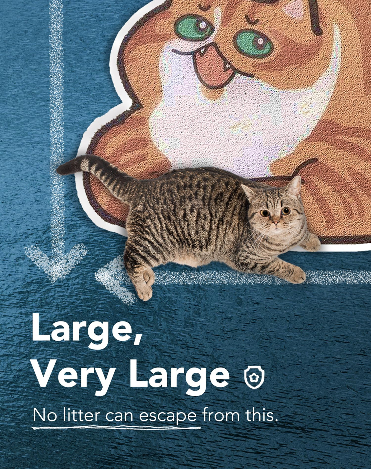 Q: What size is the Lukamoo Cute Cat Litter Mat?A: The Lukamoo Cute Cat Litter Mat measures 24'' x 32'' (60 x 90 cm), making it an extra-large mat designed to provide maximum floor protection for single-entry litter boxes.