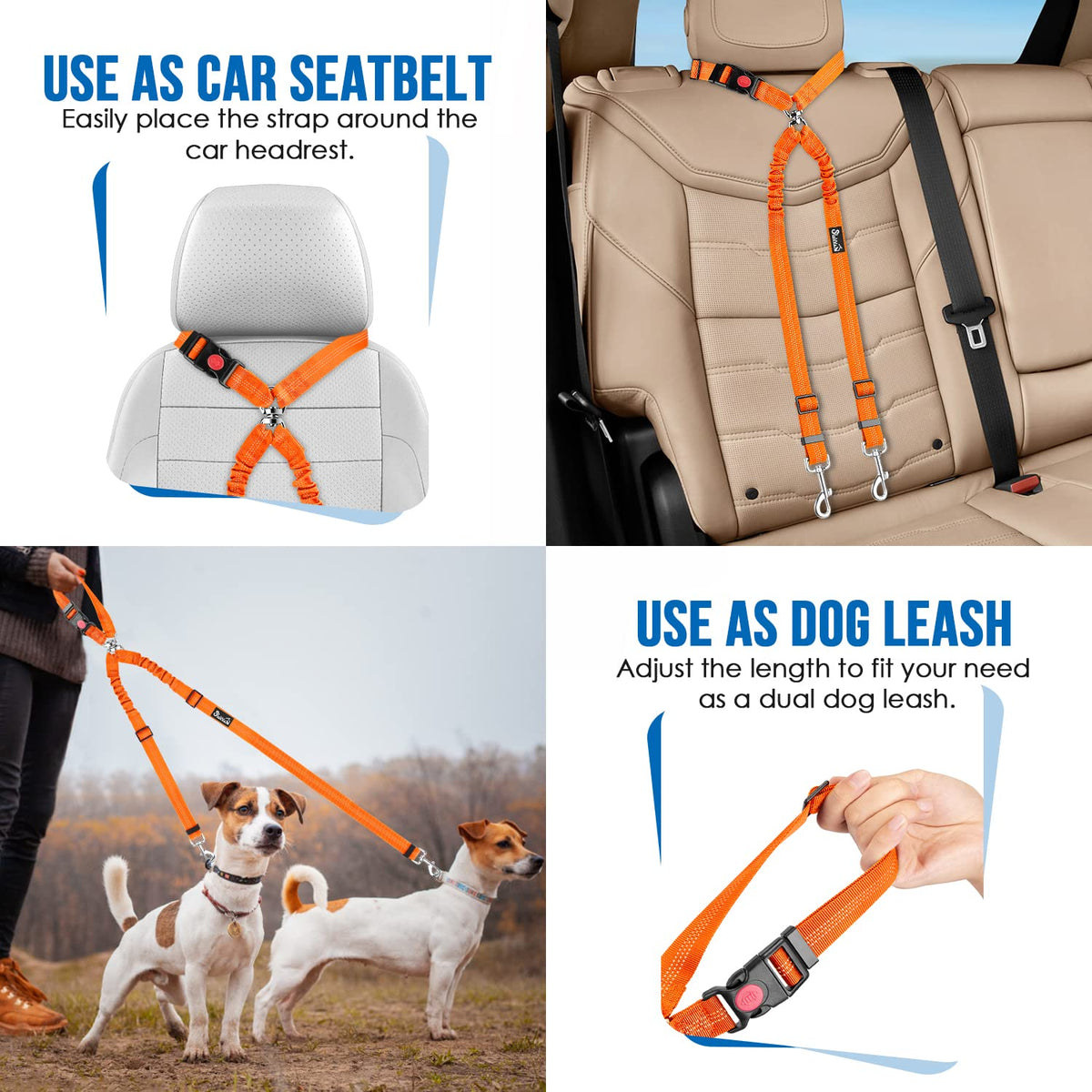Lukovee Double Dog Seat Belt, New Dual Pet Car Headrest Restraint Safety Seatbelt No Tangle Dog Leash Duty Adjust Elastic Bungee Puppy Lead Splitter Connect Harness In Vehicle Travel For 2 Dogs (Or)