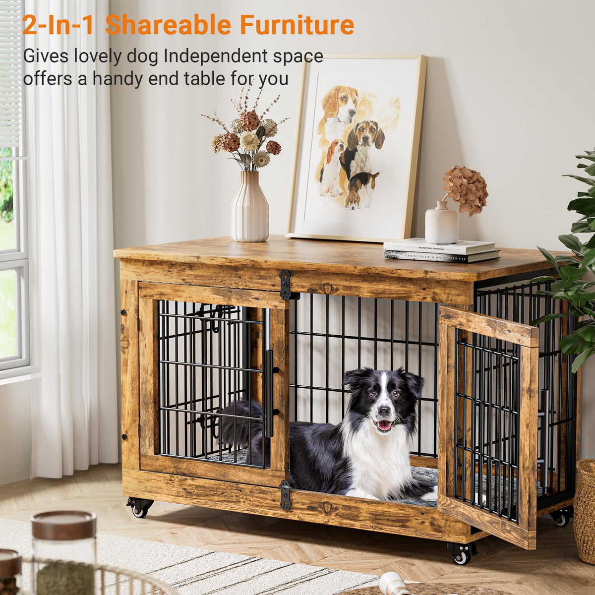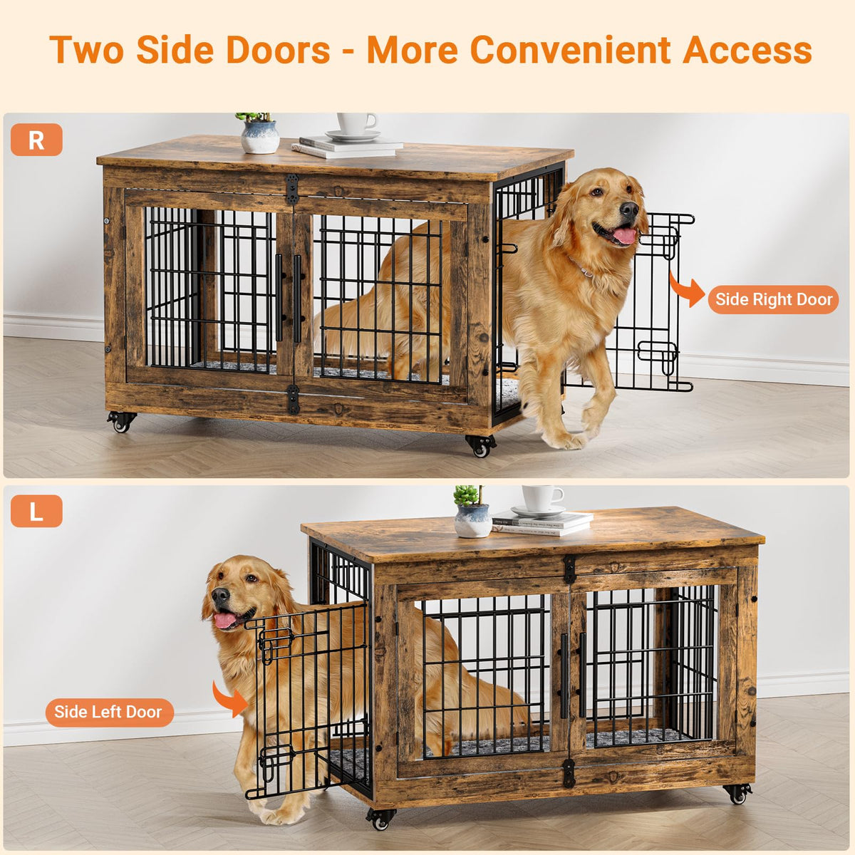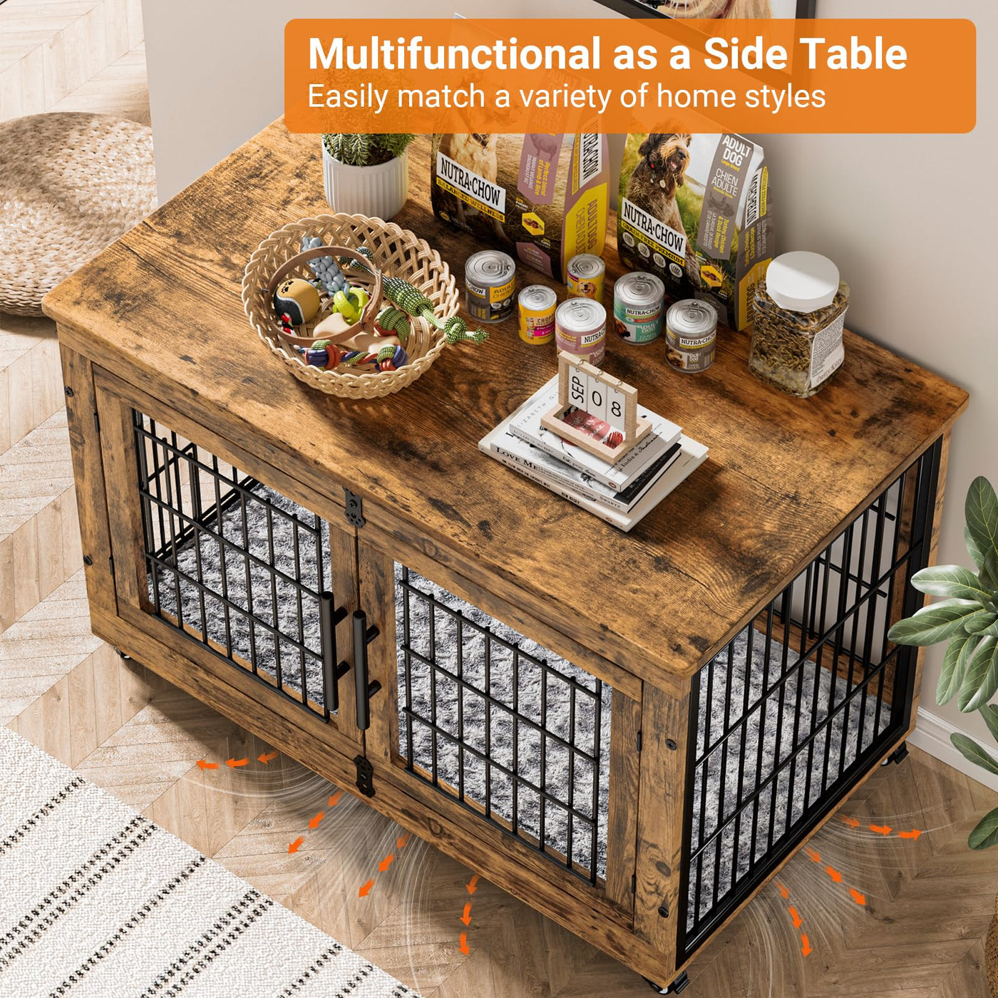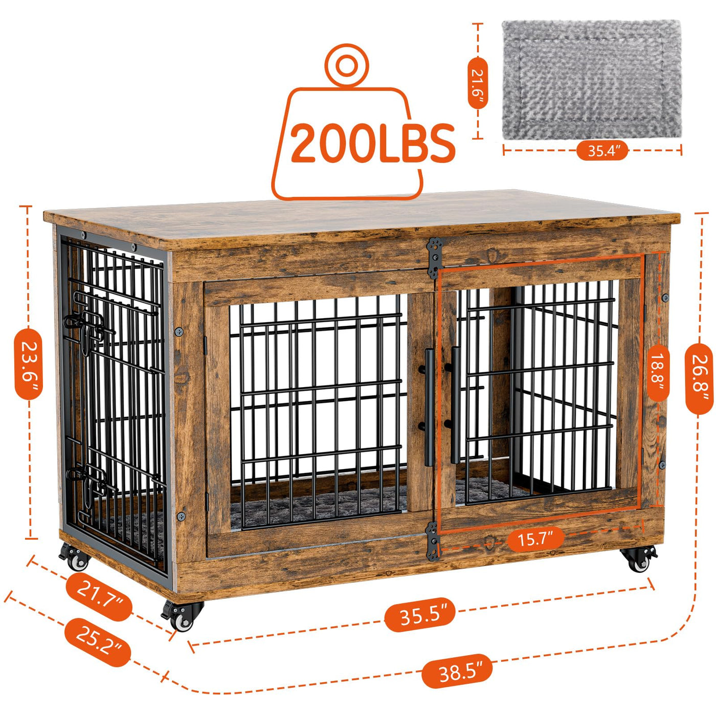 Feature - Style meets function with this versatile dog crates for large dogs that serves as a secure space for your pet as well as a practical piece of furniture that easily blends with your interior design. - This heavy-duty crate is conveniently on rolling castears to be able to move to any room in the house. - Three generously sized entry points including a wide double-door, single side-door, and easy accessibility. - The two facing doors are equipped with premium latches to securely shut closed. - High-quality iron bars enclose dog crate top design to allow for proper ventilation and 360* degree visibility. - Give your pet a safe place to rest that doesnt obstruct your room d cor thanks to this furniture-style dog pen! Tip to ensuring this crate is the right fit for your pup! While your dog is standing, measure your dog from the tip of their nose to base of their tail. While your dog is sitting or standing, measure your dog from the top of their head to the floor. Add 4 inches to determine maximum measurements. Remember, your dog should be able to stand up and turn around while in their crate. Product description Product type: dog crate Color: Rustic Brown Material: MDF+thicked metal Iron Exterior Measurements: 38.50W x 25.2D x 26.8H Iron bars are water and rust resistant Top Weight Capacity: 150lbs. Bottom Weight Capacity: 200lbs Indoor use only Bed not included Best suited for small sized dogs up to 70 lbs. Assembly Required:About 30 min