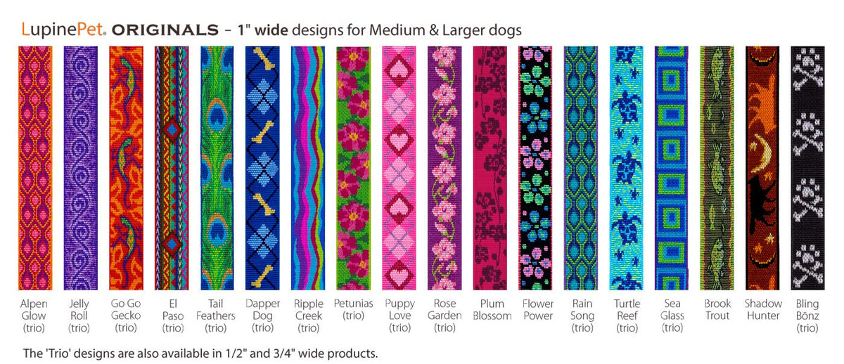 Lupine products are proudly built in Conway, New Hampshire and Guaranteed (Even if Chewed). They are not chew-proof (no fabric is!) but if they get chewed, LupinePet will replace them. Search on 'Lupine Guarantee' to see how EZ it is!Lupine Originals are offered in many different designs and colors to compliment your pet's personality. This jacquard-woven nylon has the design woven into the webbing, rather than printed or sewn on. Products are made with strong bar-tack stitching and welded steel hardware, and the ends of the material are turned under and stitched to protect fur and skin. Matching padded handle leashes, collars and other accessories are available.The 1'' wide Lupine 4-Way Adjustable Roman harness fits a wide range of body types and is especially suited for long-bodied and/or deep-chested dogs. Offered in three adjustable girth sizes: 20 to 32-inches, 24 to 38-inches, and 36 to 44-inches. To choose the correct size always measure the dog around the body, just behind the front legs. Measure snugly, and then add an extra 5-percent to find the actual adjusted size of the harness girth. Or, measure the girth strap from the dog's current harness.This harness goes on over the head. Unclip the buckle on the girth, then place the head through the opening made by the shoulder straps. Lift the left front leg over the center strap, then clip the girth strap closed. Adjust the fit of all four adjustable straps as needed.The leash can be attached in three ways: to either the O-ring on the front of the chest or the O-ring over the shoulders, or to the D-ring on the tail-end of the top strap.The harness should be removed from the dog when the leash comes off and it should not be left on an unattended dog. Lupine products are not intended for tie-out.Machine or hand-wash, warm water and mild soap (no bleach or bleach alternative). Air dry completely before use.