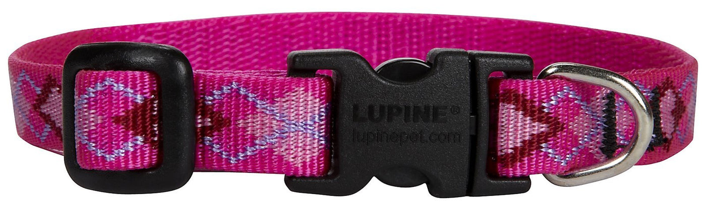 All Lupine products are proudly built in Conway, New Hampshire and Guaranteed (Even if Chewed). Made from jacquard woven nylon, with the pattern woven into the webbing (never printed or sewn on!) 1/2” wide collars are suitable for puppies and small dogs up to about 20 lbs. Features strong bar-tack stitching, welded D-ring and a custom designed side-release buckle. In a range of fashion-inspired patterns with matching leads available. Three adjustable size ranges. To determine collar size, measure snugly around the middle of the dog’s neck, then add an extra 5-percent for a comfortable fit. Machine wash, warm water, mild soap (no bleach or bleach alternative). Air dry. Lupine products are not recommended for tie-out.