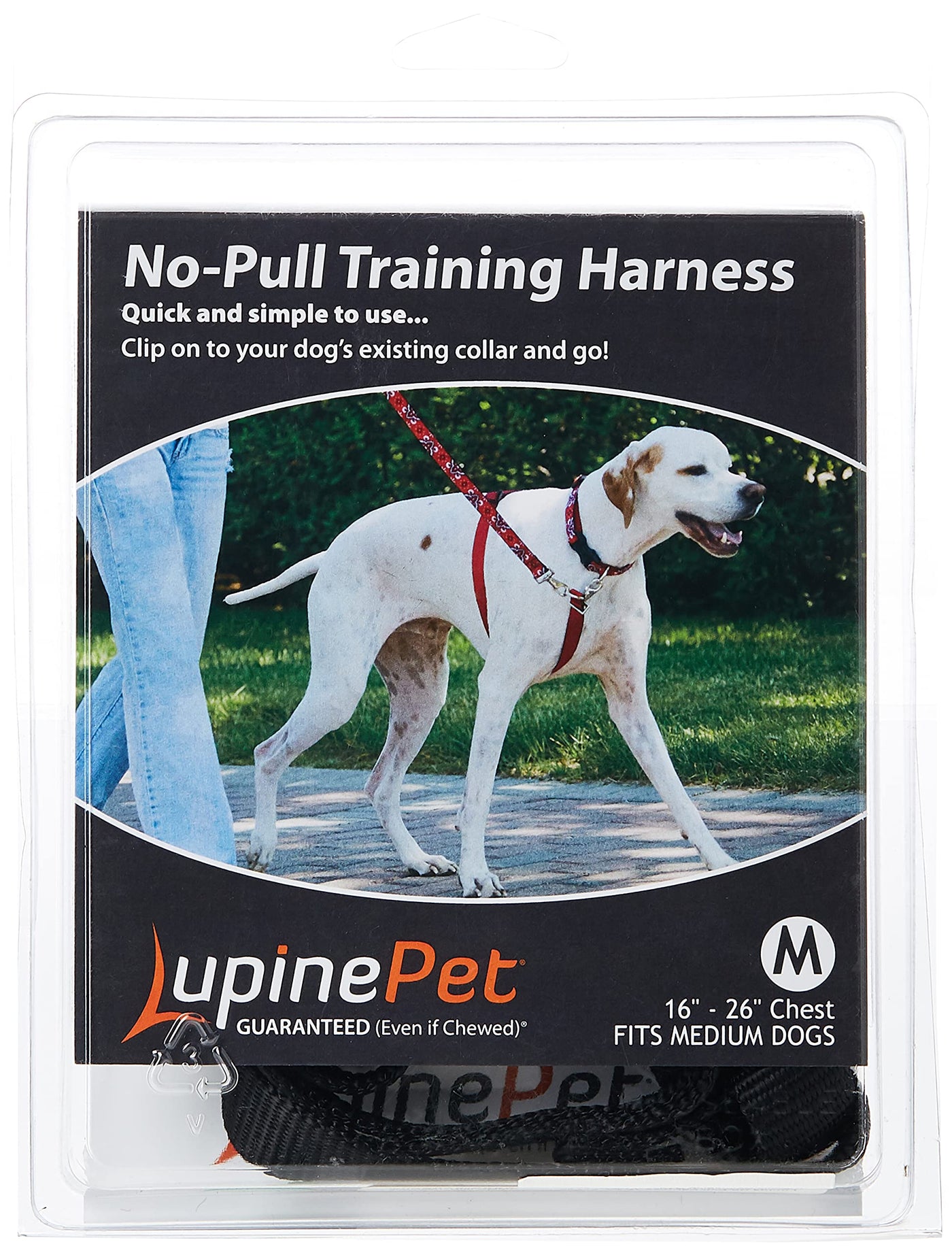 Q: Is the harness guaranteed against chewing?A: Absolutely! The Lupine No Pull Harness comes with a guarantee, even if chewed, and is proudly made in New Hampshire since 1990.