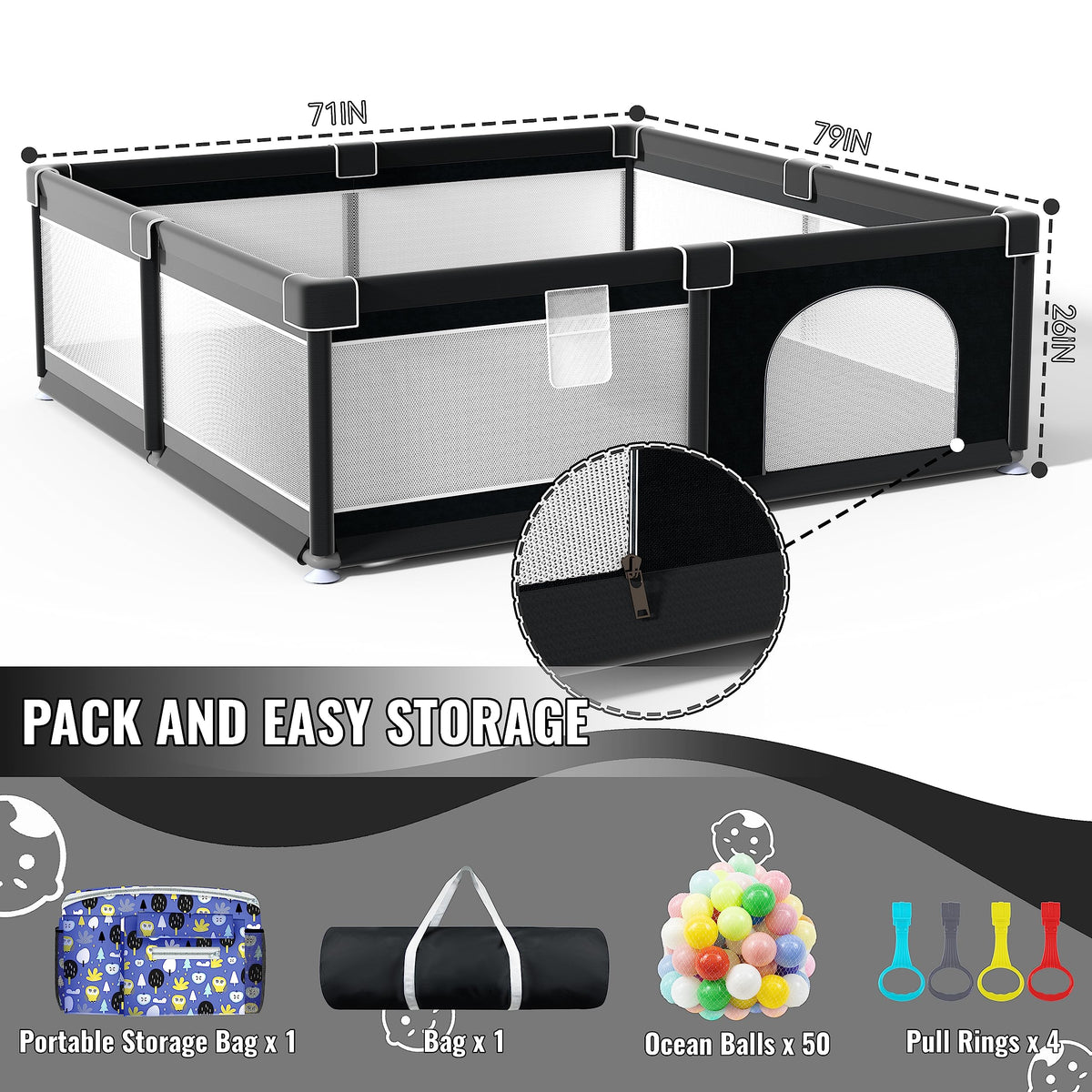 LUTIKIANG Large Baby Fence, Babys Safe House, Great Gift for Parents! LUTIKAING Baby Playpen designed for babies and toddlers to have a safe and comfortable play area. This playpen is perfect for indoor and outdoor use and is made from high-quality materials to ensure durability and safety. While the previous version came with a mat, the new playpen set is without a mat, providing parents the flexibility to use their preferred mat or to purchase a separate one. The playpen set comes with ocean balls, pull rings, and a storage bag for easy transport and storage. The ocean balls adds an element of fun to your babys playtime, while the pull rings provide an added challenge to develop their motor skills. The storage bag allows for easy transport and storage of the playpen, making it perfect for on-the-go parents or for those with limited storage space. The playpen is designed to keep your baby safe from any potential hazards, such as stairs, pets, or dangerous household items. The sturdy construction and the use of non-toxic materials ensure that your baby is safe at all times while playing in the playpen. The playpen is also easy to assemble and disassemble, making it convenient for parents who need to set up and take down the playpen frequently. We understand that as a parent, your babys safety is your top priority, and thats why we have designed this playpen to give you peace of mind. With the new playpen set without a mat, you have the freedom to choose the mat that best suits your needs or to use a mat that you already own. Our goal is to provide you with a product that not only ensures your babys safety but also adds to their fun and developmental experiences. Choose our playpen set for a safe and enjoyable playtime for your little one.