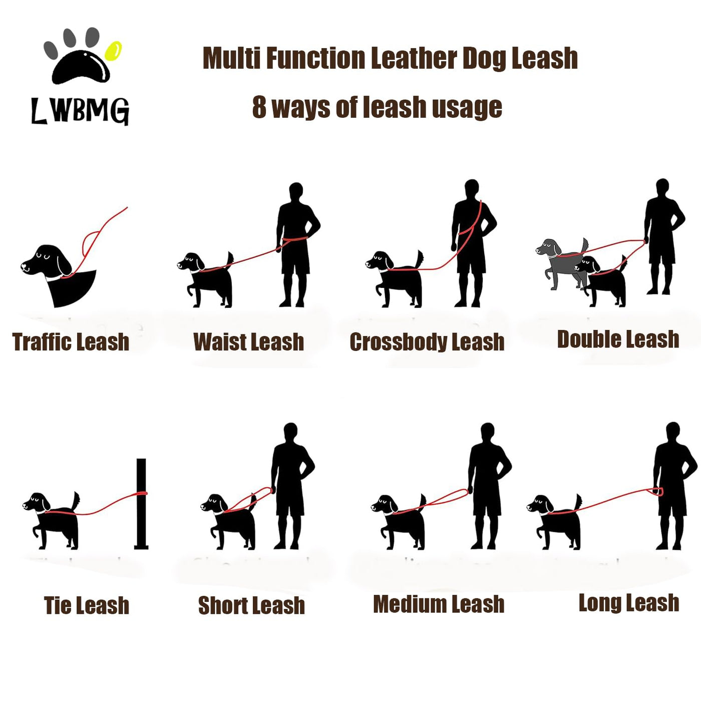 Why Choose Lwbmg Leather Dog Leash:Lwbmg Are Engaged In Providing High Quality Pet Supplies On Amazon Over 10 Years. This Multifunction Leather Dog Leash Has 8 Ways To Use. The Rust-Proof Brass Clasp That Adds Durability And A Smooth And Shining Look. This Leather Dog Training Leash Is Hand Stiching On Both Ends To Offer A Fashionable And Beautiful Finish While Maintaining The Strength. The Heavy-Duty Dog Leash Has 3 Size To Choose, Is Ideal For Daily Walking And Training Of Small Medium And Large Sized Dogs.This Leather Dog Leash Is Made Of Selected Soft Full-Grain Leather In Clear Texture And Has With Good Tensile Force.Important Notes1.Avoid Pet Chewing Or Biting;2.Store It In Dry And Cool Places And Keep It Away From Fire, Heat And Chemicals;3.Do Not Wash, Bleach Or Iron It.