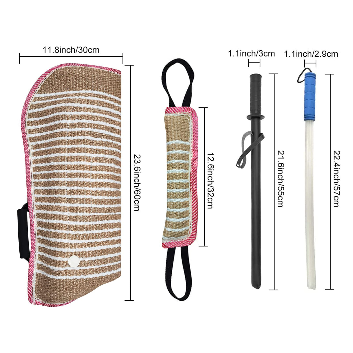 This Training Kit Is Perfect For Professional Trainers And Beginners Training Dogs.It Can Be Used Both On Right And Left Arms. Interlayer Is Thick & Soft Pad, Easy To Put On And Take Off Even Wearing Thick Clothes. Dog Bite Training Set Includes &Size: 1 X Dog Bite Sleeve 23.6*11.8''(60*30Cm). 1 X Dog Bite Pillow Tug Toy 12'' Long (32Cm). 1 X Black Dog Training Stick 21.6 *1.1''(55 *3Cm). 1 X White Dog Training Stick Size 22.4*1.1''( 57*2.9Cm).