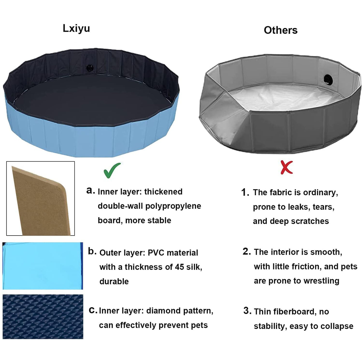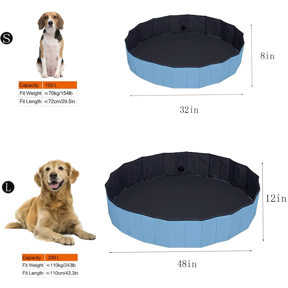 Package Includes: Package Includes: 1X Foldable Pet Pool ,1X Extra Pool Coversize: L--48X12, S--32 X 8-Two Different Models, All Equipped With Corresponding Size Swimming Pool Coverslightweight: It Can Be Folded Into A Reduced Size To Reduce Space, And It Is Convenient To Carry When Traveling.Preferred Quality: Ultra-Tough Pvc Material Is Used, And The Selected Material Improves The Sealing Performance Of The Swimming Pool, Which Is Not Easy To Leak And Is Safer. Safety: The Unique Non-Slip Bottom Design Makes Your Pets And Children Safer When Bathing Or Playing.Notesplease Trim Your Pets Nails Before Use To Avoid Excessive Damage To The Swimming Pool. Please Set Up The Swimming Pool On A Flat Ground Without Sharp Objects. After Use, Please Dry It Before Storing To Prolong The Service Life Of The Plastic Pool.