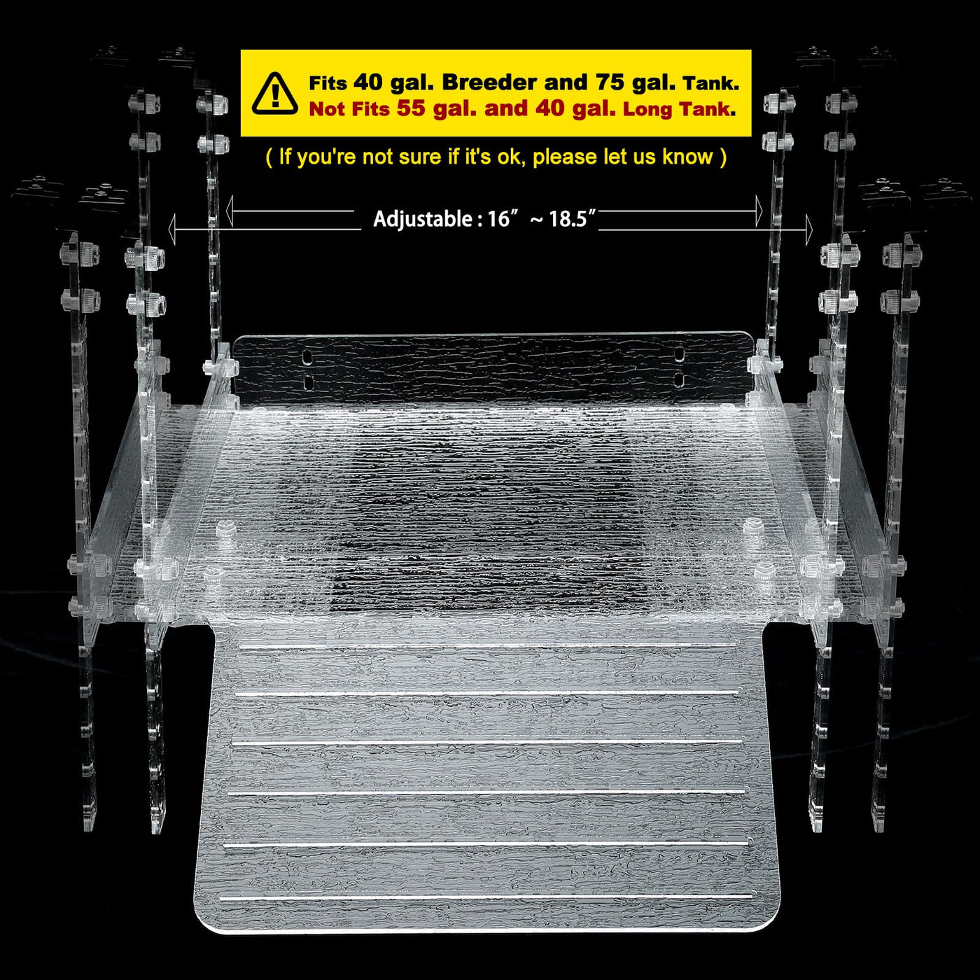 Platform Width: 16-18 1/2 Height: 3-14 Top Hook: 1/2-1 1/4 Due to the presence of the screws, it should fit within an aquarium width of 16 1/2 -19 Not fits 55 gallon tank.