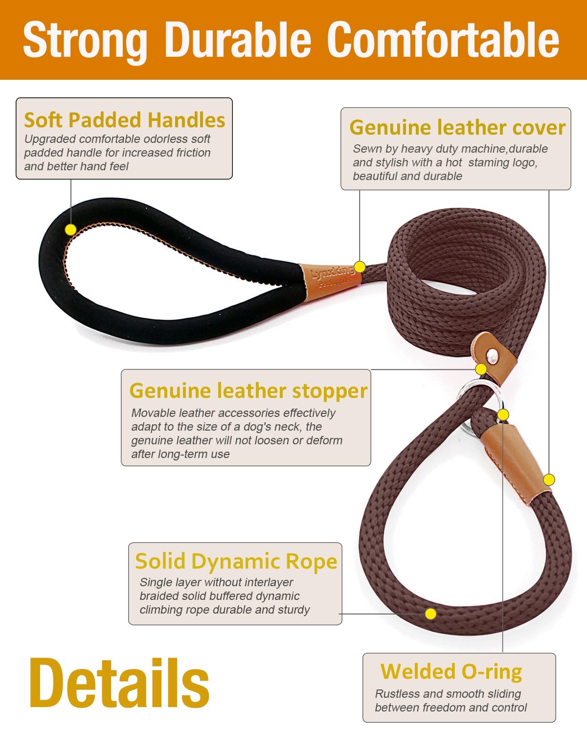Q: What materials are used in the lynxking dog leash?A: The lynxking dog leash is made from strong and heavy-duty braided nylon rope, complemented by a patterned padded handle and a super sturdy metal ring. This construction ensures durability and comfort during use, making it suitable for everyday walks and training.