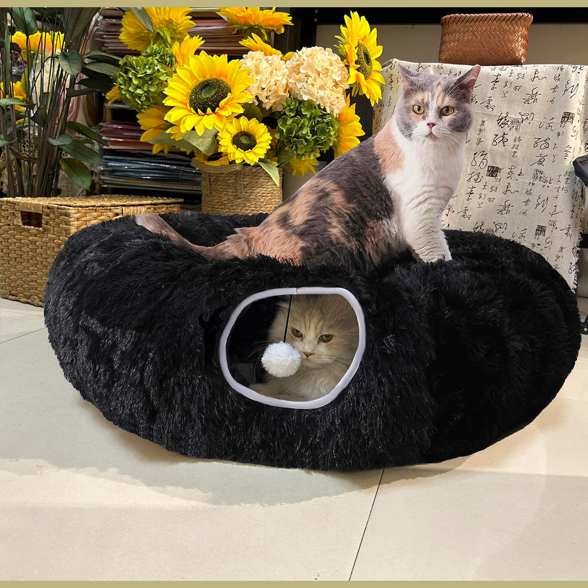 Mabaytir Cat Tunnel Bed For Indoor Cats Black Plush, Collapsible Play Tube With Removable Cushion, Sturdy Cat Toy Playhouse, Sof