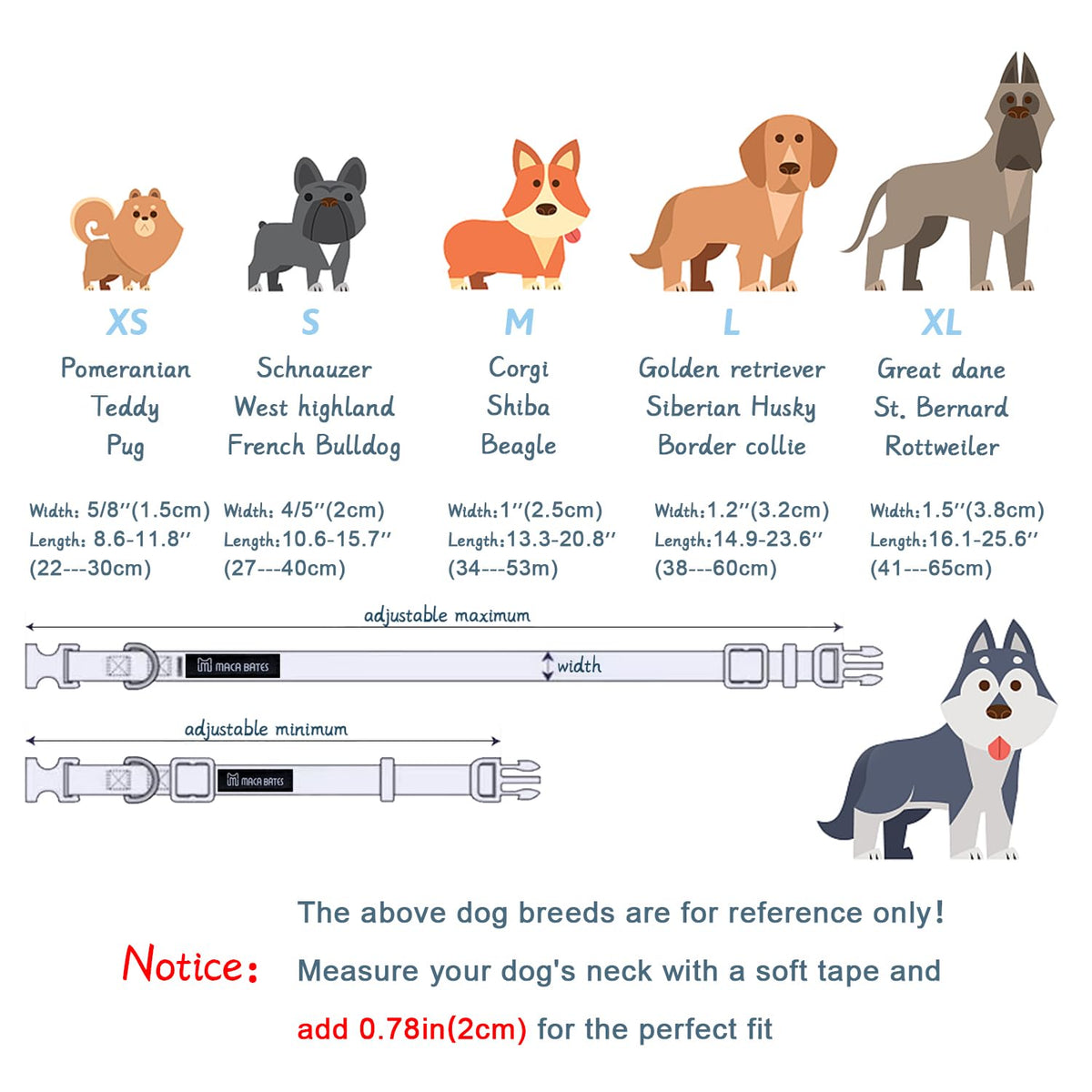 Q: What sizes does the Maca Bates Dog Collar come in?A: The Maca Bates Dog Collar is adjustable and fits neck sizes from 16 to 24 inches, making it suitable for small, medium, and large dogs.