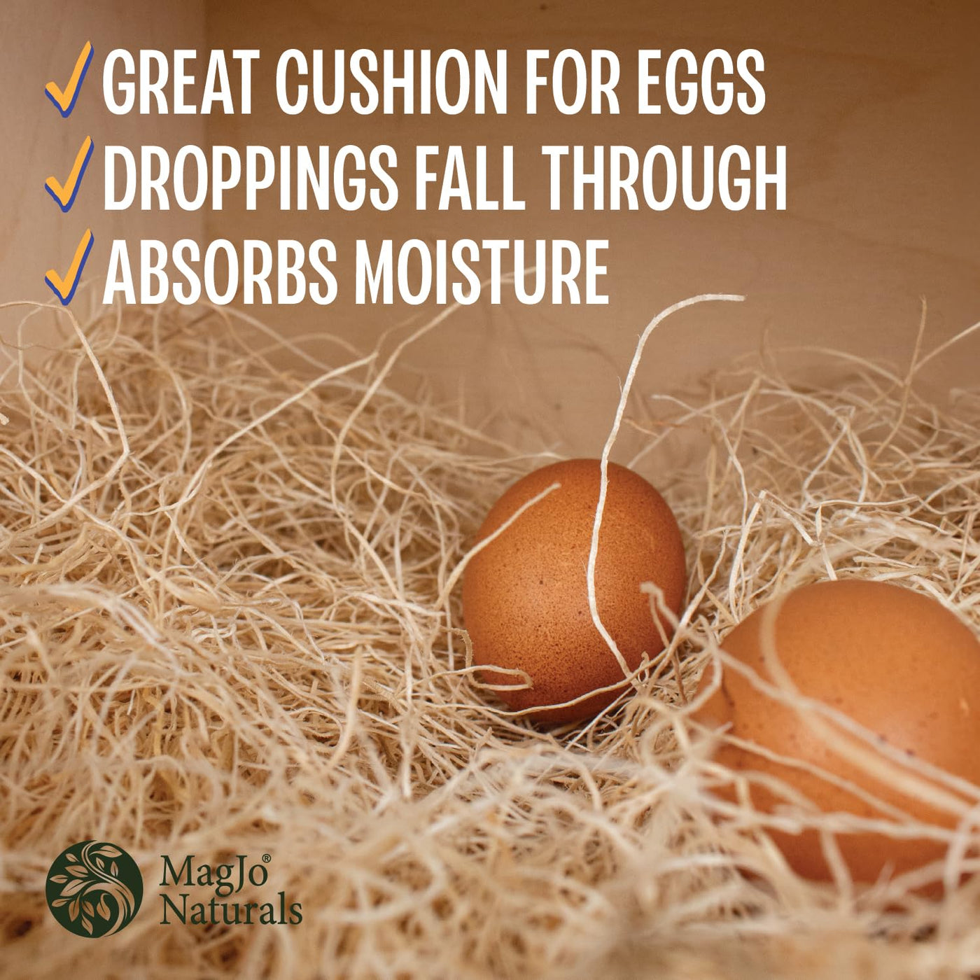 Q: What are the benefits of using MagJo Premium Aspen Nesting Liners for chicken bedding?A: MagJo Premium Aspen Nesting Liners provide a healthier environment for your chickens compared to pine or cedar bedding. The Aspen shavings are designed to cushion eggs and hens while absorbing moisture and odors, promoting a clean nesting area.