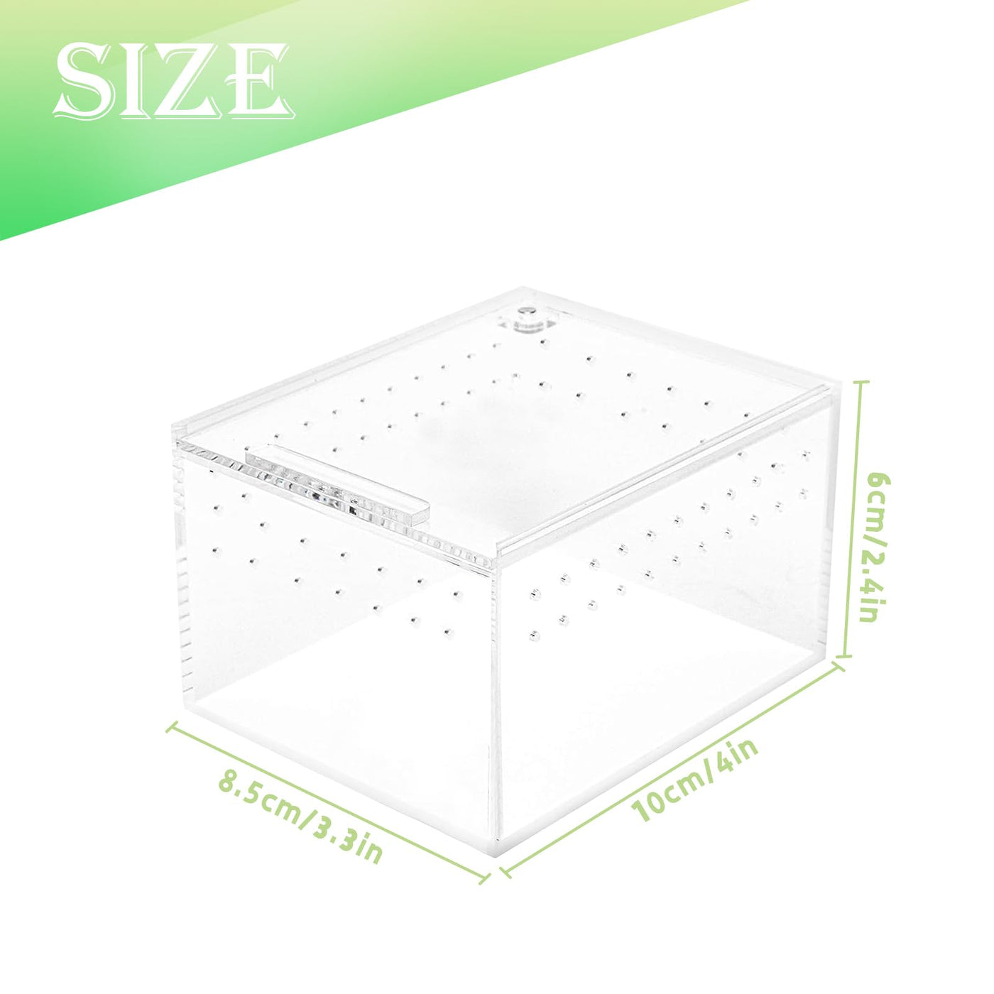 Features: The Top Features An Innovative Sliding Design And Magnetic Closure, Making It Convenient To Feed Your Pets And Preventing Any Unwanted Escapes. With Its Clear And Transparent Design, Our Reptile Breeding Box Allows For Easy Observation And Effortless Cleaning. Perfectly Designed For The Housing Of Spiders, Insects, And Small Reptiles, Providing A Spacious And Comfortable Living Area. Specification: Material:Arcylic Color:Clear Size:3.94 X 3.35 X 2.36 Inch / 10 X 8.5 X 6Cm Package Include: 1 X Magnetic Acrylic Case