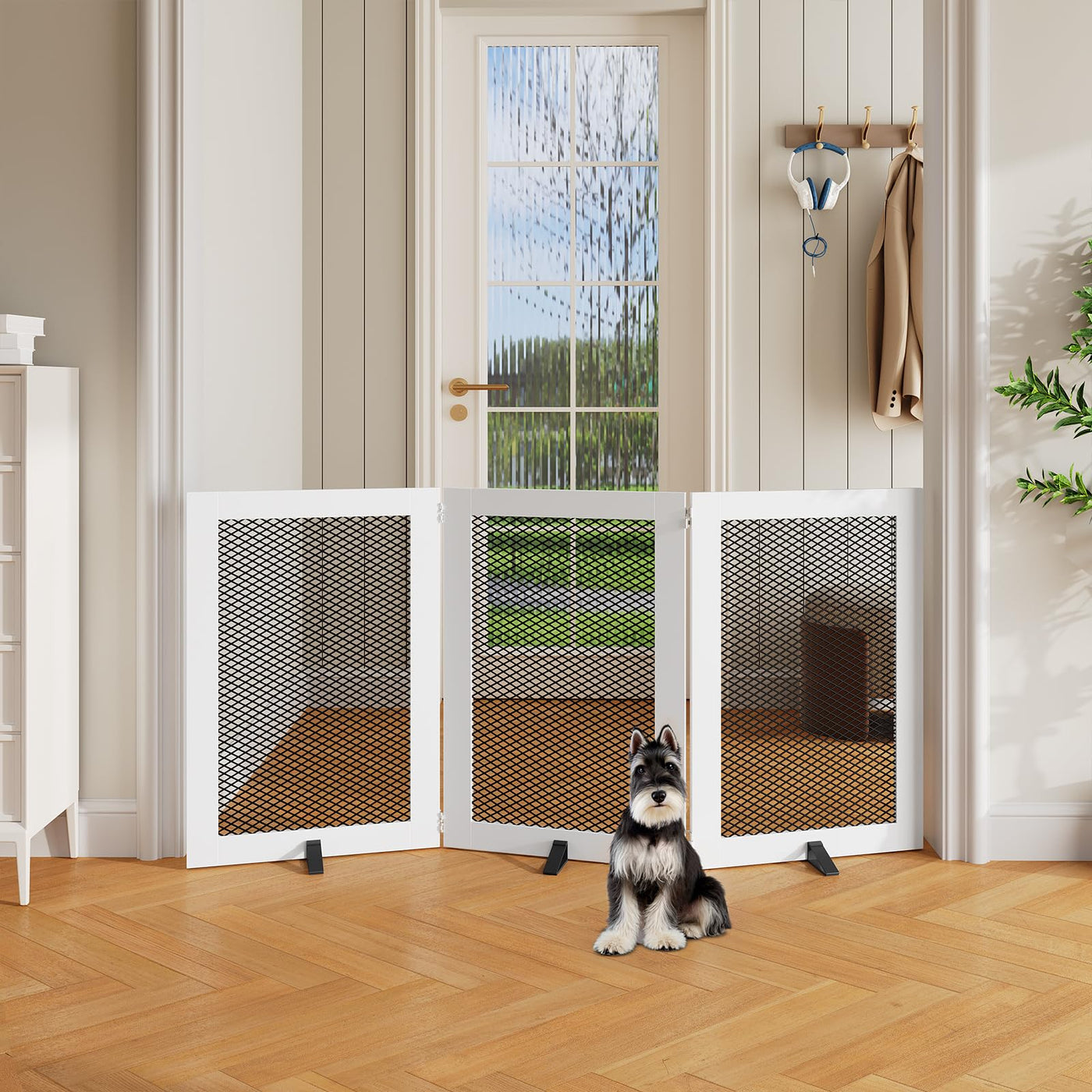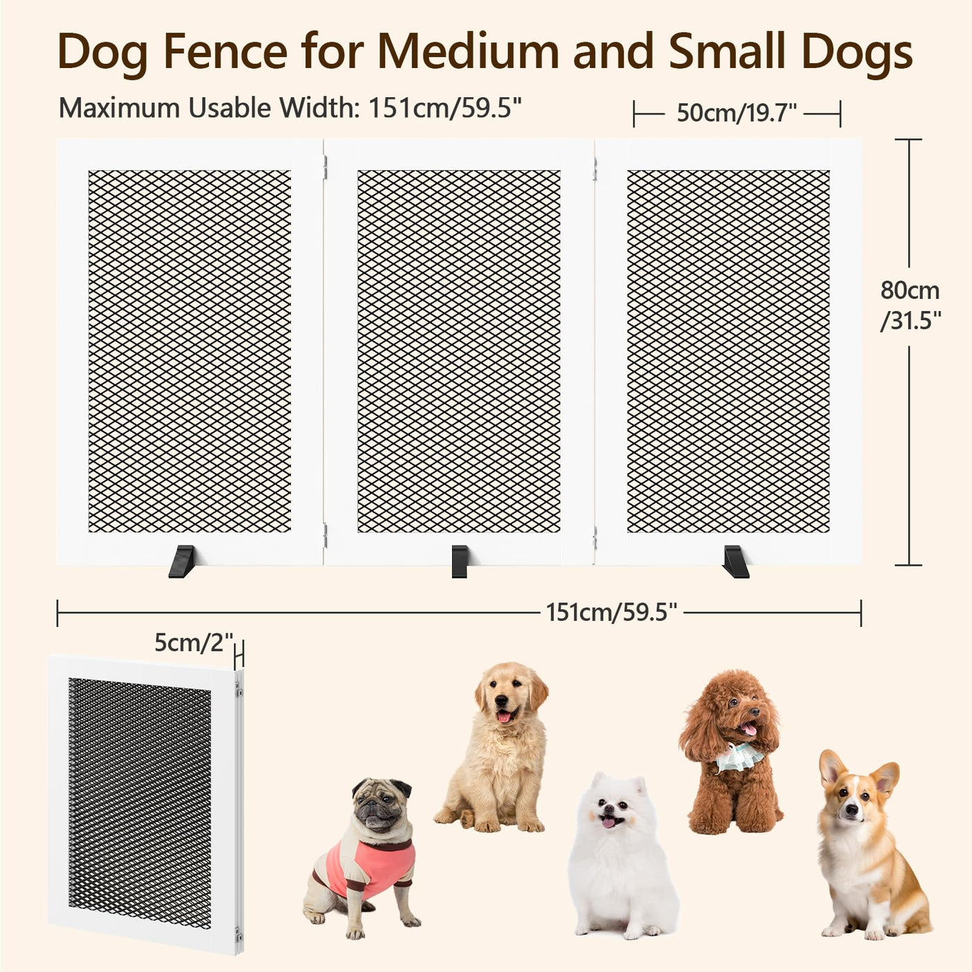 MAHANCRIS Freestanding Indoor Dog Gate This foldable dog fence features robust 360 hinges for versatile configurations. It adapts flexibly to bedrooms, fireplaces, doorways, hallways, and kitchens, restricting pet access and connecting into playpens. Designed for small to medium dogs, its chew and wear-resistant. The freestanding design requires no wall drilling, preserving your homes structure. Lightweight and foldable for easy storage, it can be effortlessly moved with one hand to any desired location. Specifications: Color: Whita and Black Material: Metal, Particleboard Product Size: 59.5W x 31.5H Each Panel Size: 19.7W x 31.5H Product Weight: 15.8 lb Package Contents: 1 x Dog Fence 1 x Accessory Kit 1 x Instructions MAHANCRIS Notes: For safety reasons, children are prohibited from climbing on the product. This product is suitable for puppies and small to medium-sized dog breeds.