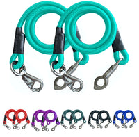 A pair of multi-purpose 36 shock absorbing bungee trailer ties constructed of heavy duty bungee cord and features a nickel-plated quick release panic snap for safety at one end and a bull snap at the other end.. A great item for use in stall, paddock, trailer or to take along to the horse shows, an essential for the aisle-way or the wash stall. It secures back of a trailer to the horse bridle or halter for feeding, grooming or saddling your horse. Product Details: Premium Quality Bungee Trailer ties for Horses 36 Inch Length Heavy-Duty Bungee Cord Pack of 2 High Quality Nickel Plated Panic Snap and Bull Snap Hardware