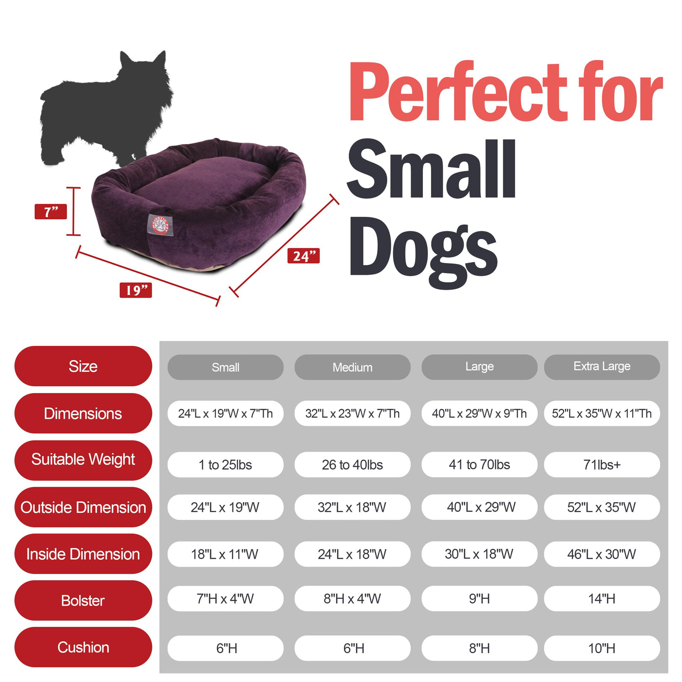 Q: What size is the Majestic Pet Round Dog Bed?A: The Majestic Pet Round Dog Bed has dimensions of 24 inches in length, 19 inches in width, and 7 inches in thickness, making it ideal for small dogs who enjoy curling up or stretching out.