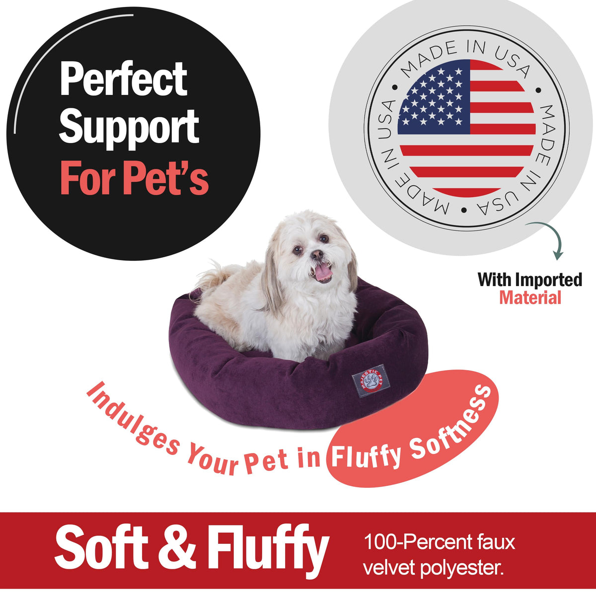 Q: What materials are used in the Majestic Pet Micro Velvet Calming Dog Bed?A: The Majestic Pet Micro Velvet Calming Dog Bed is crafted from plush, pet-friendly polyester, ensuring maximum comfort for your pet. Additionally, it features a waterproof 300/600 Denier base to protect your floors from spills and accidents.