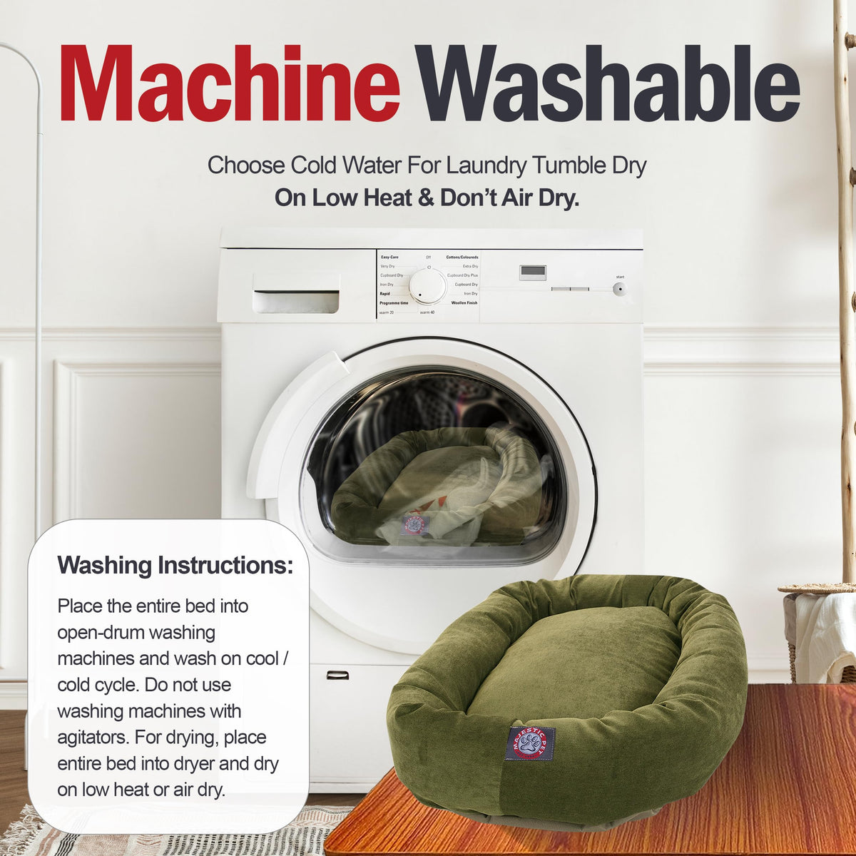 Q: Is the dog bed machine washable?A: Yes, the Majestic Pet Dog Bed is machine washable, making it easy to keep clean and maintain. The materials are designed to withstand frequent washing while retaining their charm and plushness.